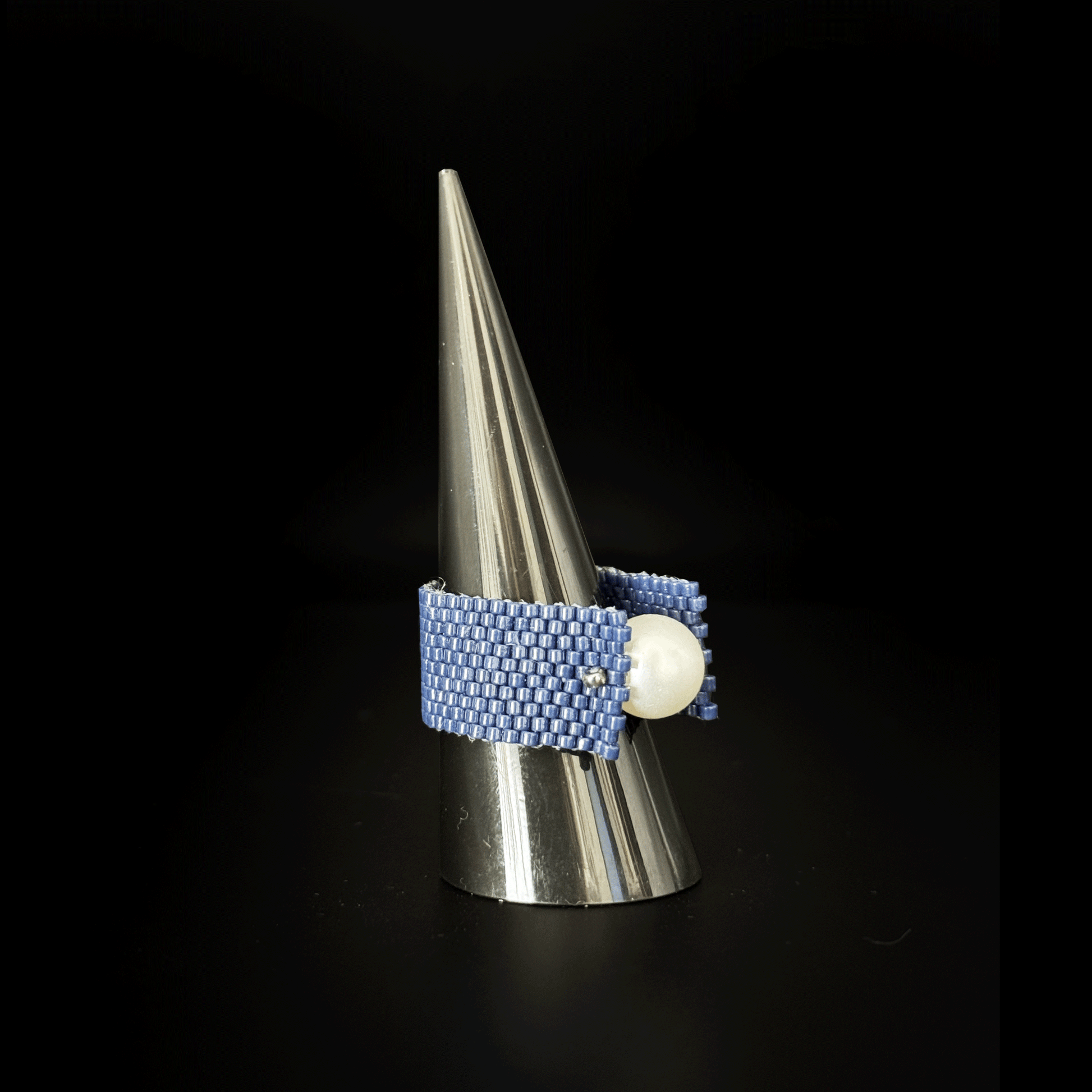 Un diseño fresco y elegante. La estructura azul tejida a mano sostiene una perla central que parece flotar como espuma marina. Perfecto para combinar lo casual con un toque de sofisticación.