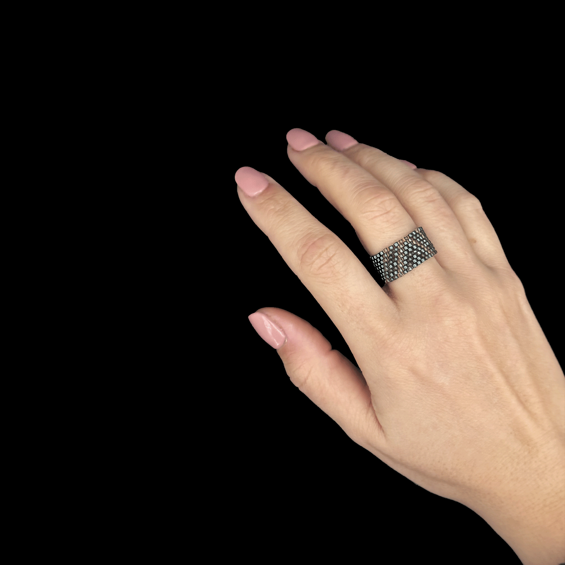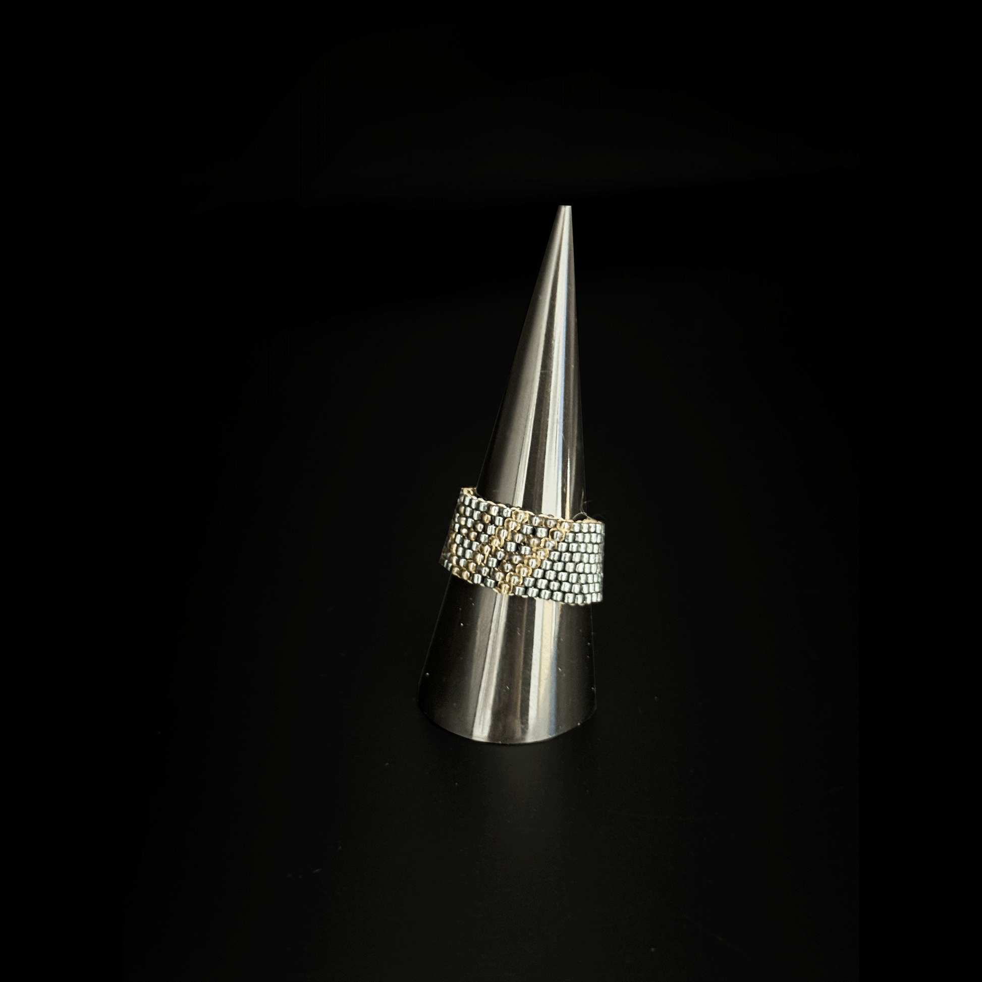 Minimalismo artesanal. Este anillo rectangular de mostacillas negras y grisáceas aporta estructura, textura y elegancia discreta. Un diseño contemporáneo que se adapta a cualquier estilo sin perder carácter.