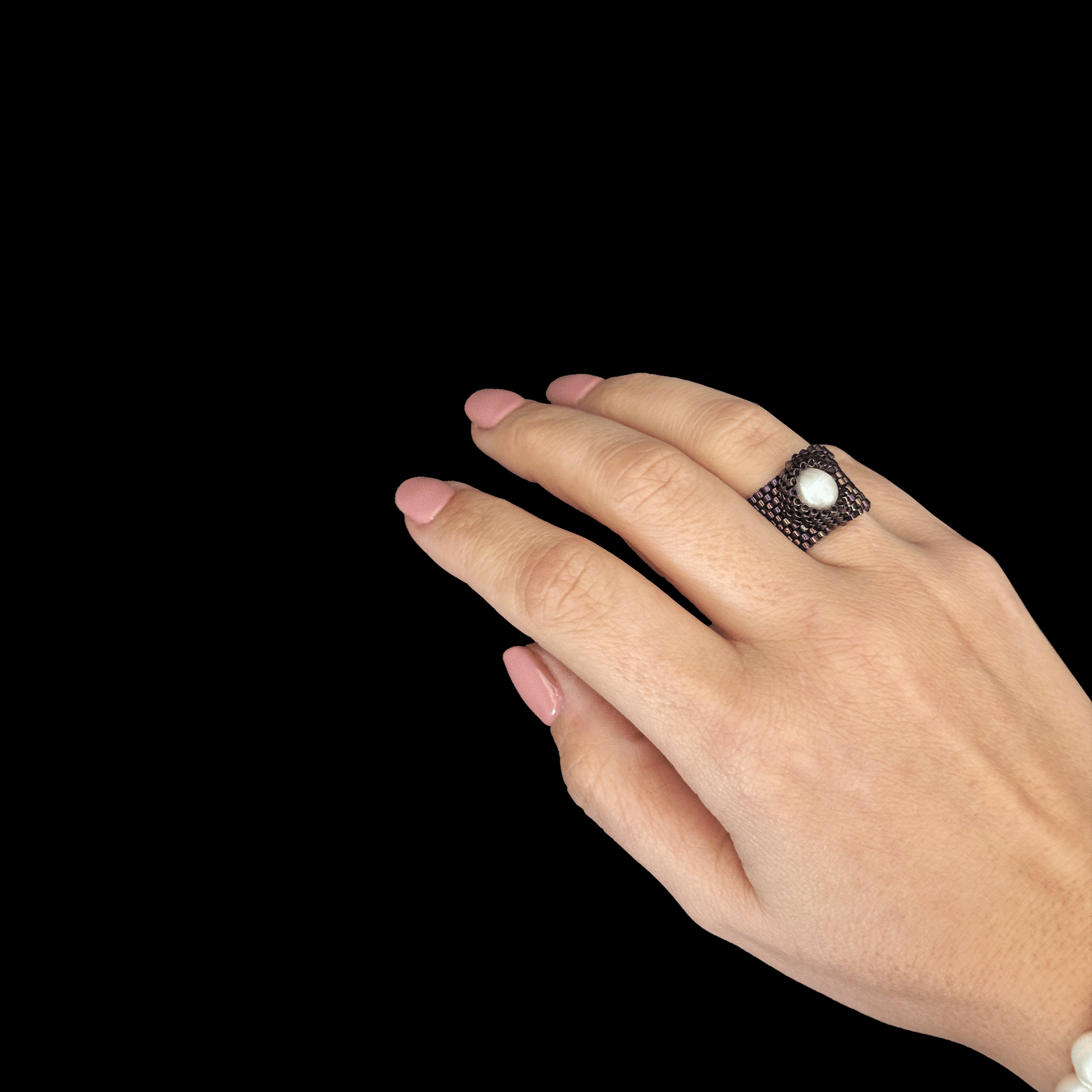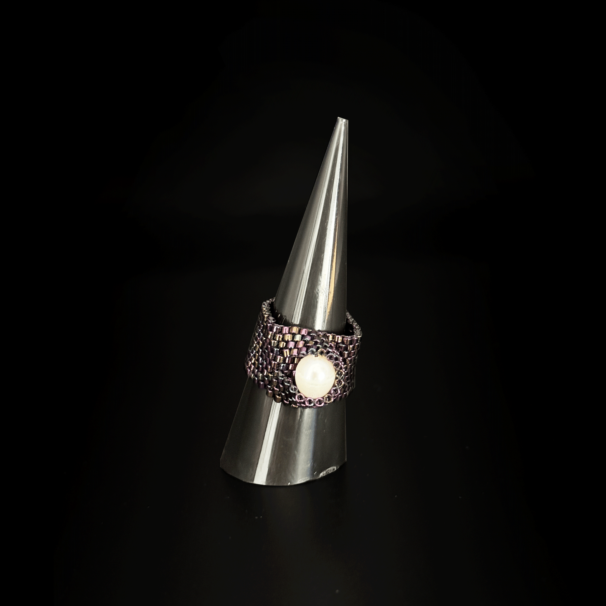 Minimalismo con alma. Mostacillas oscuras con reflejos violetas dan vida a una base cuadrada que enmarca una piedra blanca, como si protegiera una luna en la noche. Simple, pero con un poder sutil.