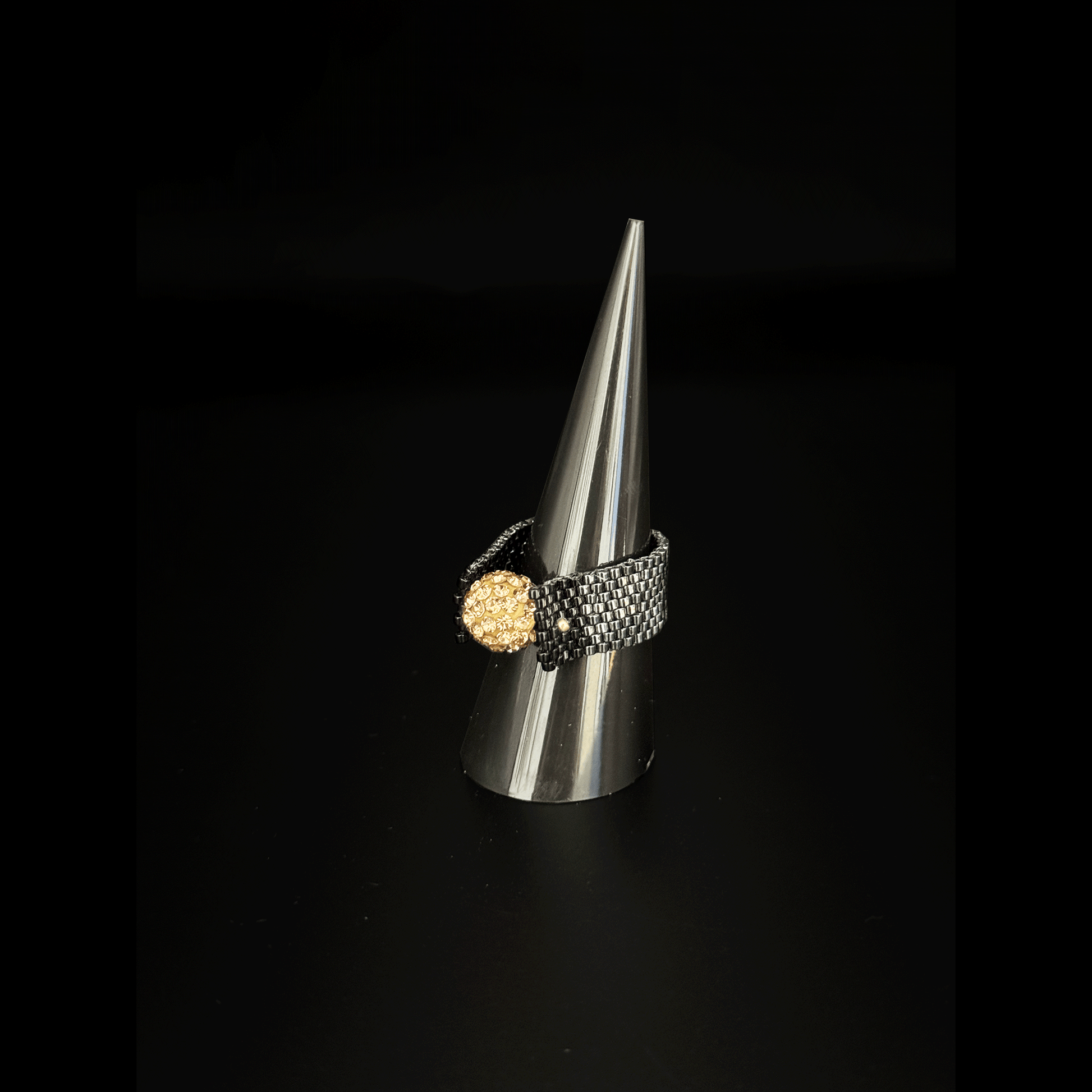 Minimalismo con alma. Mostacillas oscuras con reflejos violetas dan vida a una base cuadrada que enmarca una piedra blanca, como si protegiera una luna en la noche. Simple, pero con un poder sutil.