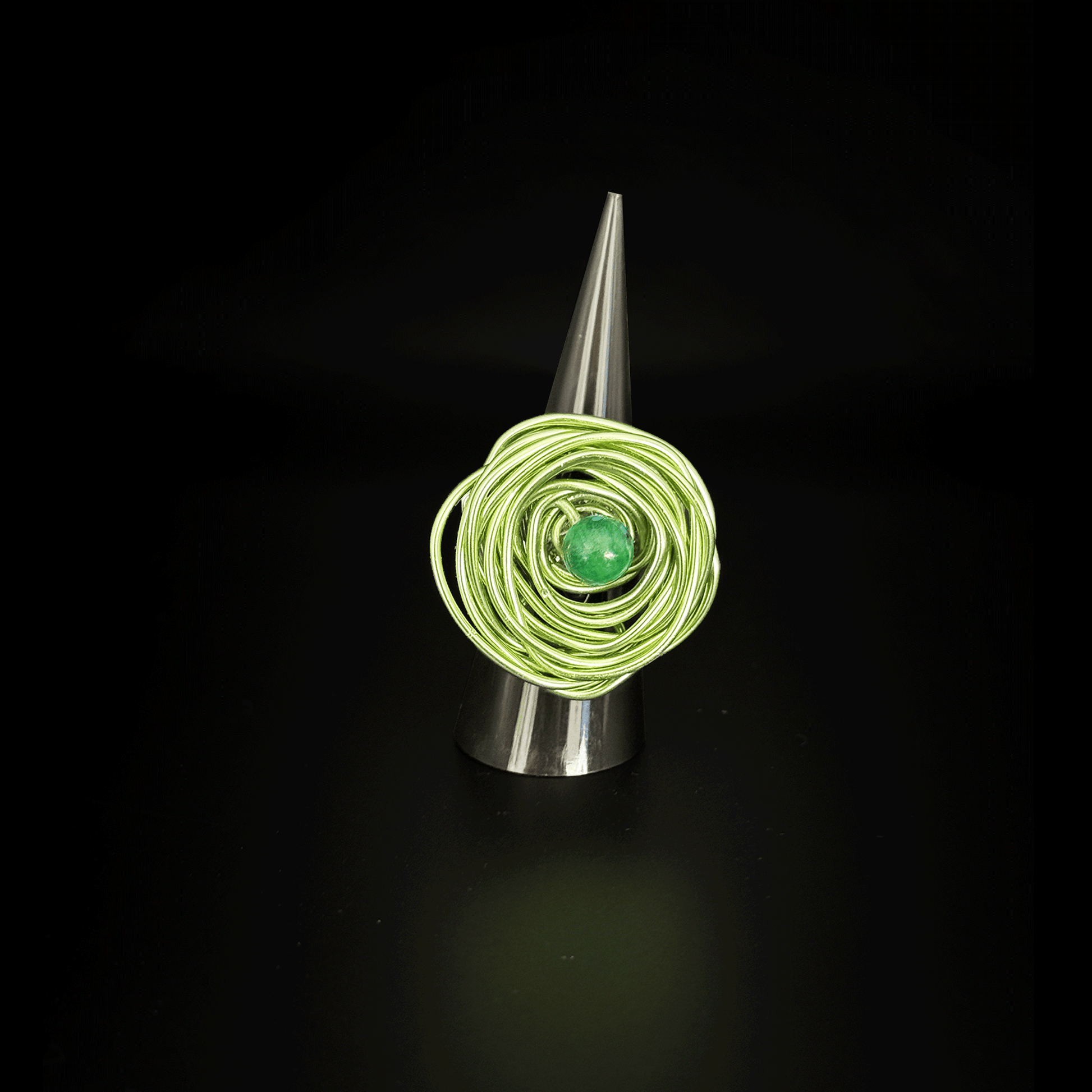 Este anillo mezcla un alambre verde metálico en forma de espiral con una piedra tornasolada en el centro. Un diseño que evoca frescura, conexión con la naturaleza y una personalidad vibrante.