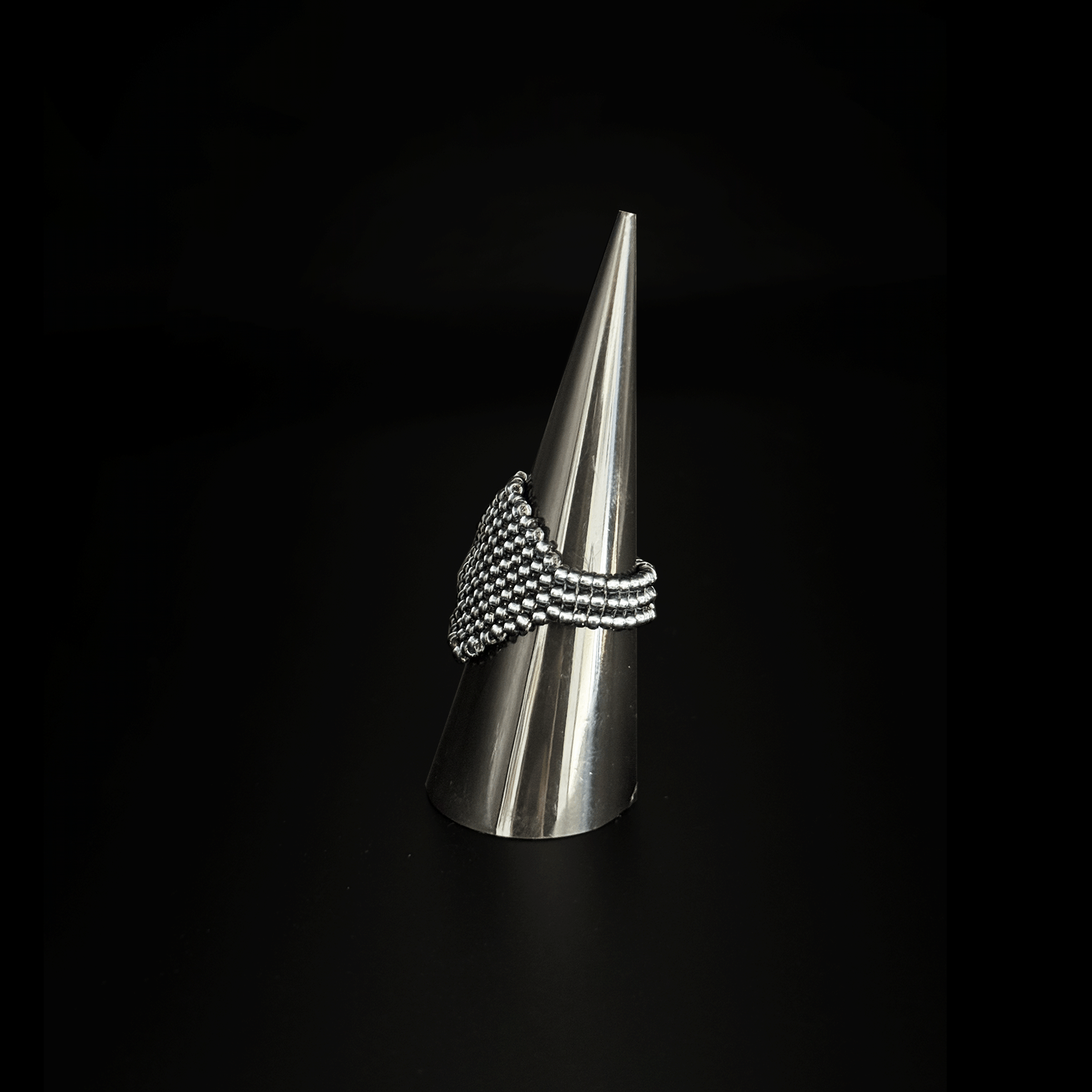 Ligero, abstracto y con movimiento. Un anillo que recuerda pequeñas estrellas unidas por lazos invisibles. Una pieza libre, perfecta para almas creativas.