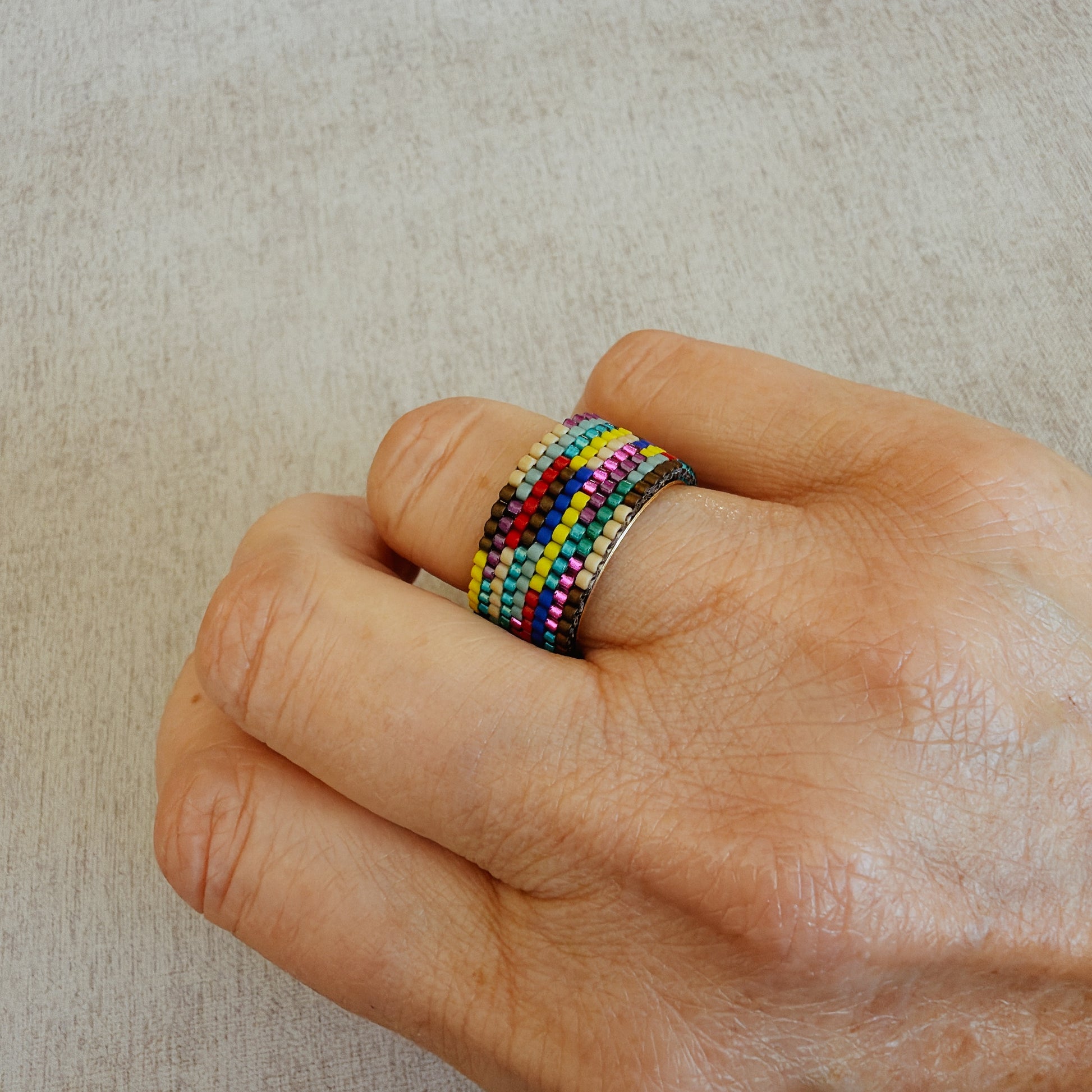 Este anillo es una pieza vibrante, tejida a mano con mostacillas Miyuki sobre una base metálica dorada. Cada fila de color —magenta, turquesa, amarillo, rojo, azul, blanco, café y más— se entrelaza en un patrón que parece casi una danza gráfica de luz, orden y movimiento. El dorado interior le da un brillo cálido que contrasta con el ritmo cromático de su exterior, y su estructura abierta permite un ajuste cómodo.