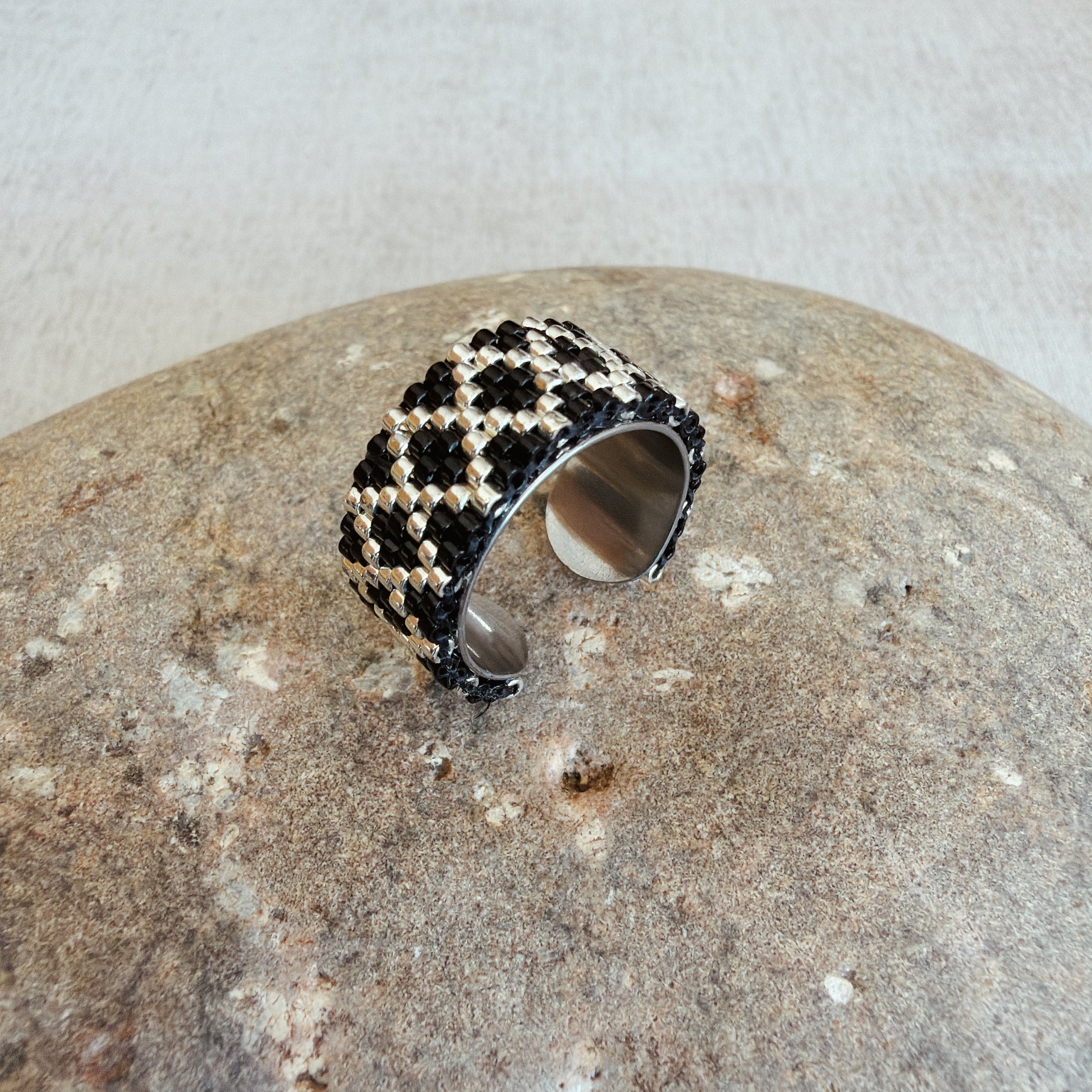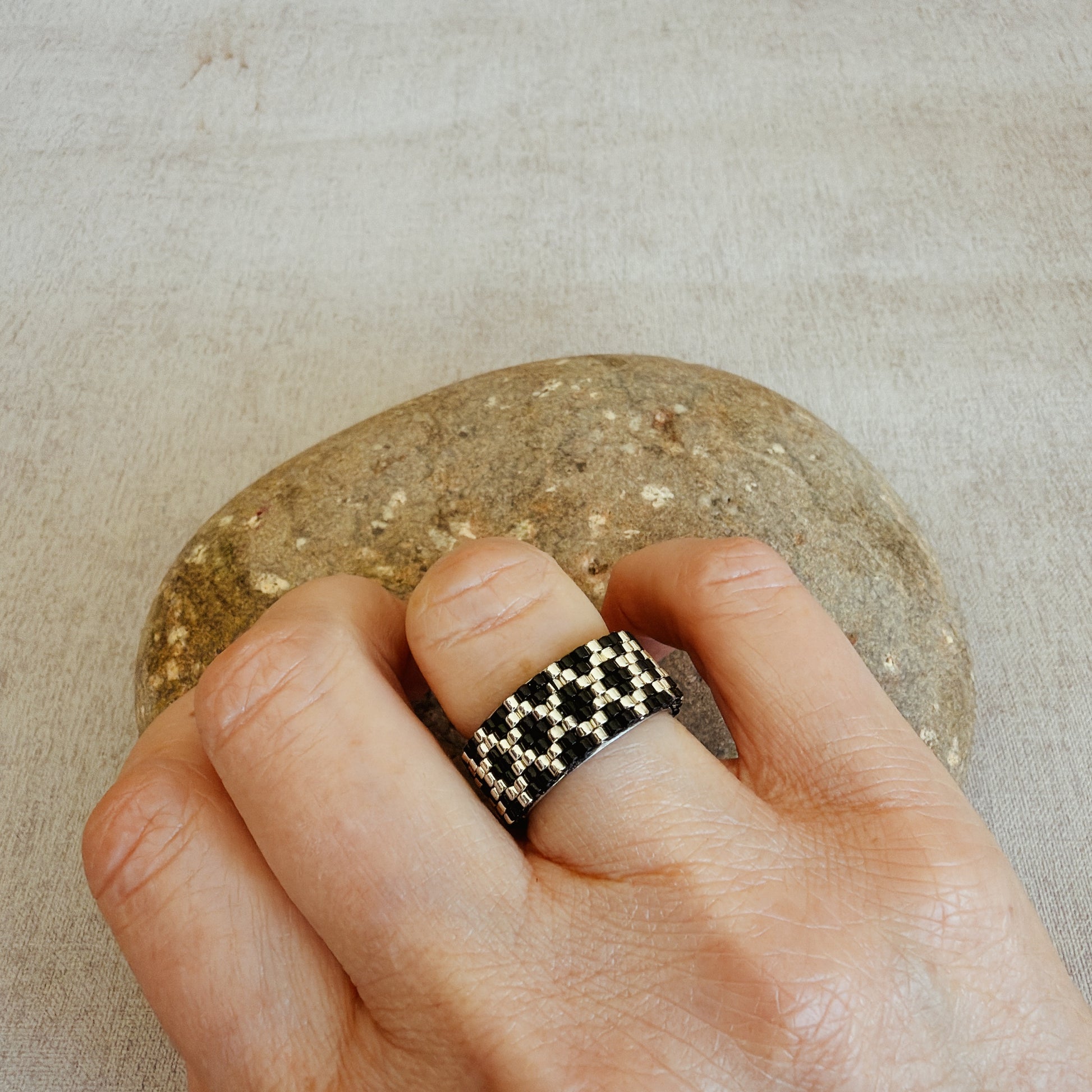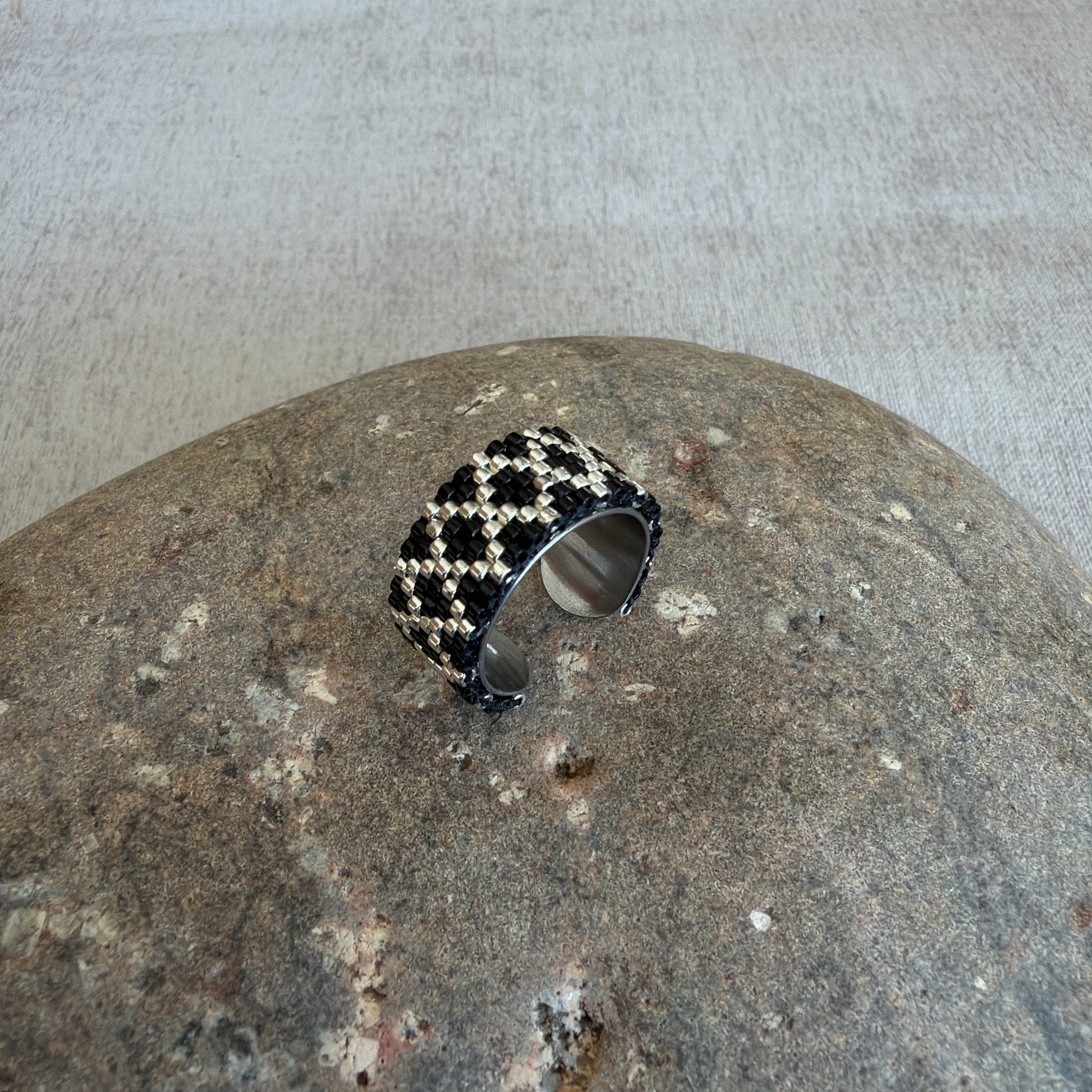 Un anillo que juega con el contraste como una dama que se desliza entre la sombra y la luz. El plateado tenue de las mostacillas refleja destellos suaves, mientras que el negro profundo le da ancla y carácter. Su patrón rítmico recuerda los caminos de un tejido antiguo, pero con una fuerza moderna.