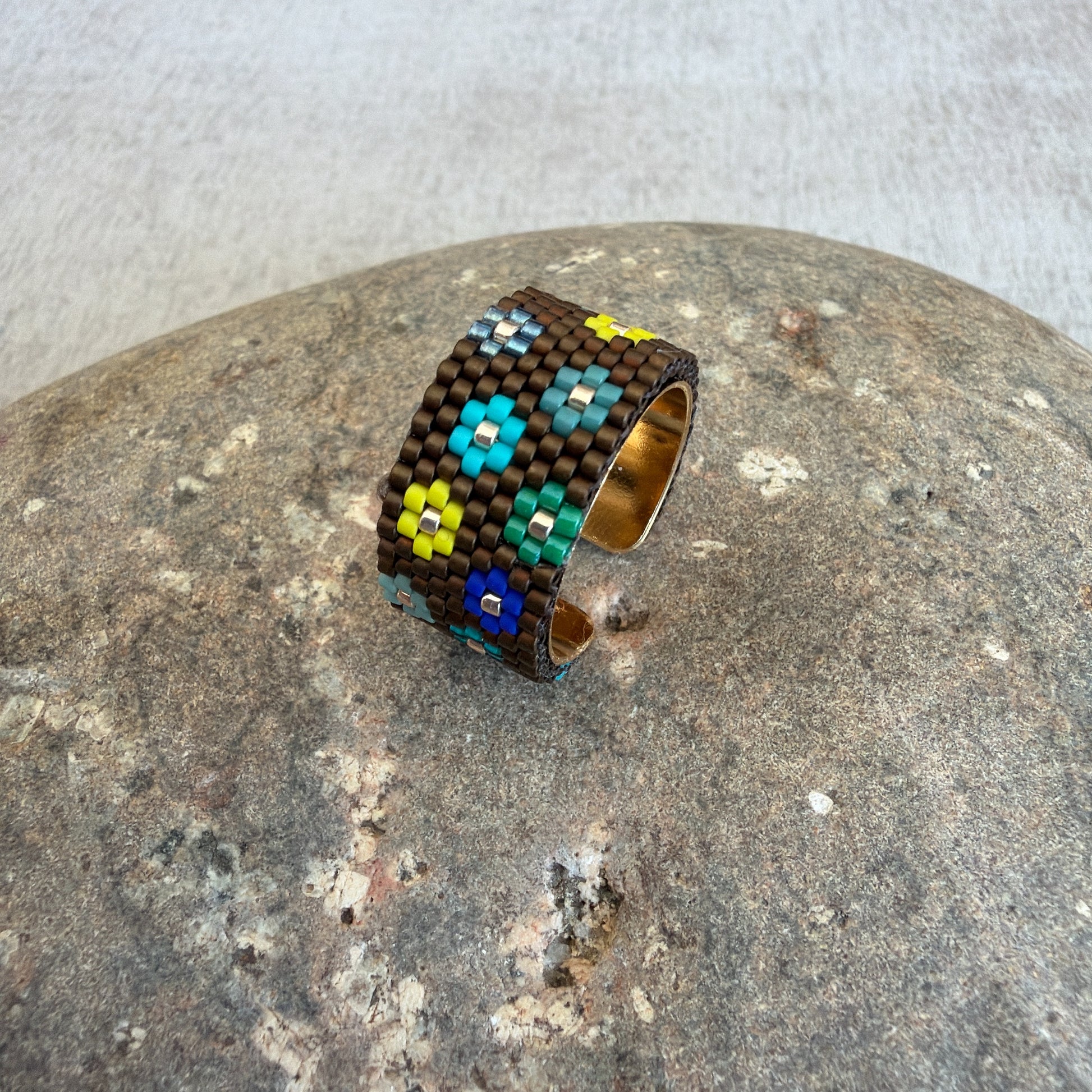 Este anillo está lleno de pequeños secretos. Sobre un fondo de marrón profundo, emergen flores mínimas en azul, verde y turquesa, como si brotaran desde la tierra tibia después de una lluvia. Cada mostacilla parece contar una historia —una pausa, una chispa de color, una memoria.