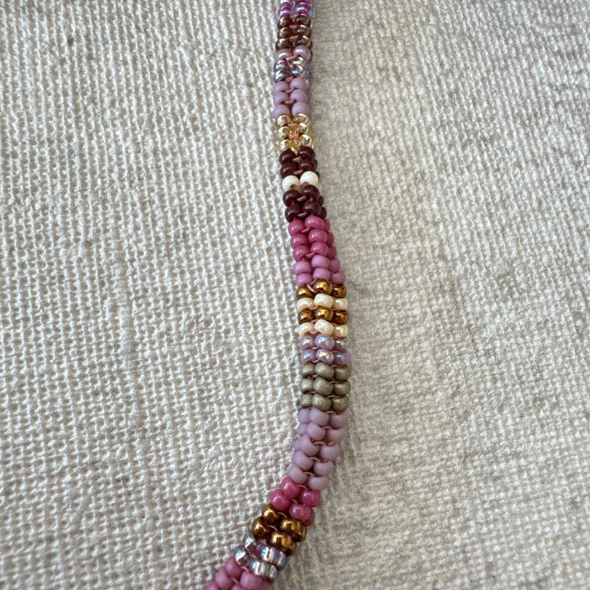 No sé por qué me gusta tanto hacer este tipo de collares. Creo que es porque voy eligiendo colores y diseño a medida que lo voy tejiendo. Esta vez, elegí colores más suaves para las que les gusta el palo rosa.