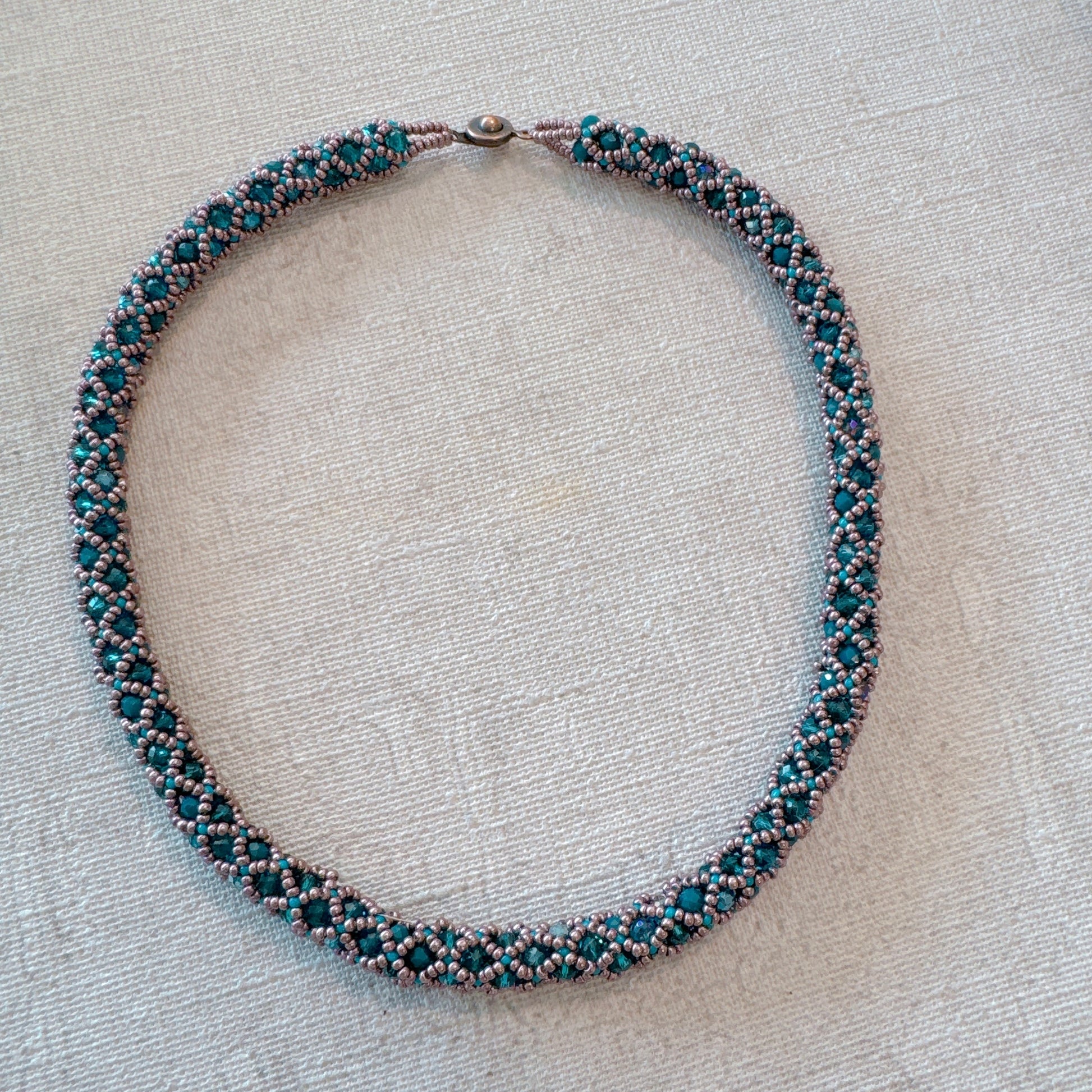 Mientras mi marido estuvo en coma, yo me sentaba a su lado y lo acompañaba. Un día se me quedó el mat para las mostacillas pero me las arreglé usando materiales hospitalarios. Tanto que pedí algunos para llevarme a mi taller. Este collar me ayudó a mantener la calma y las esperanzas.
