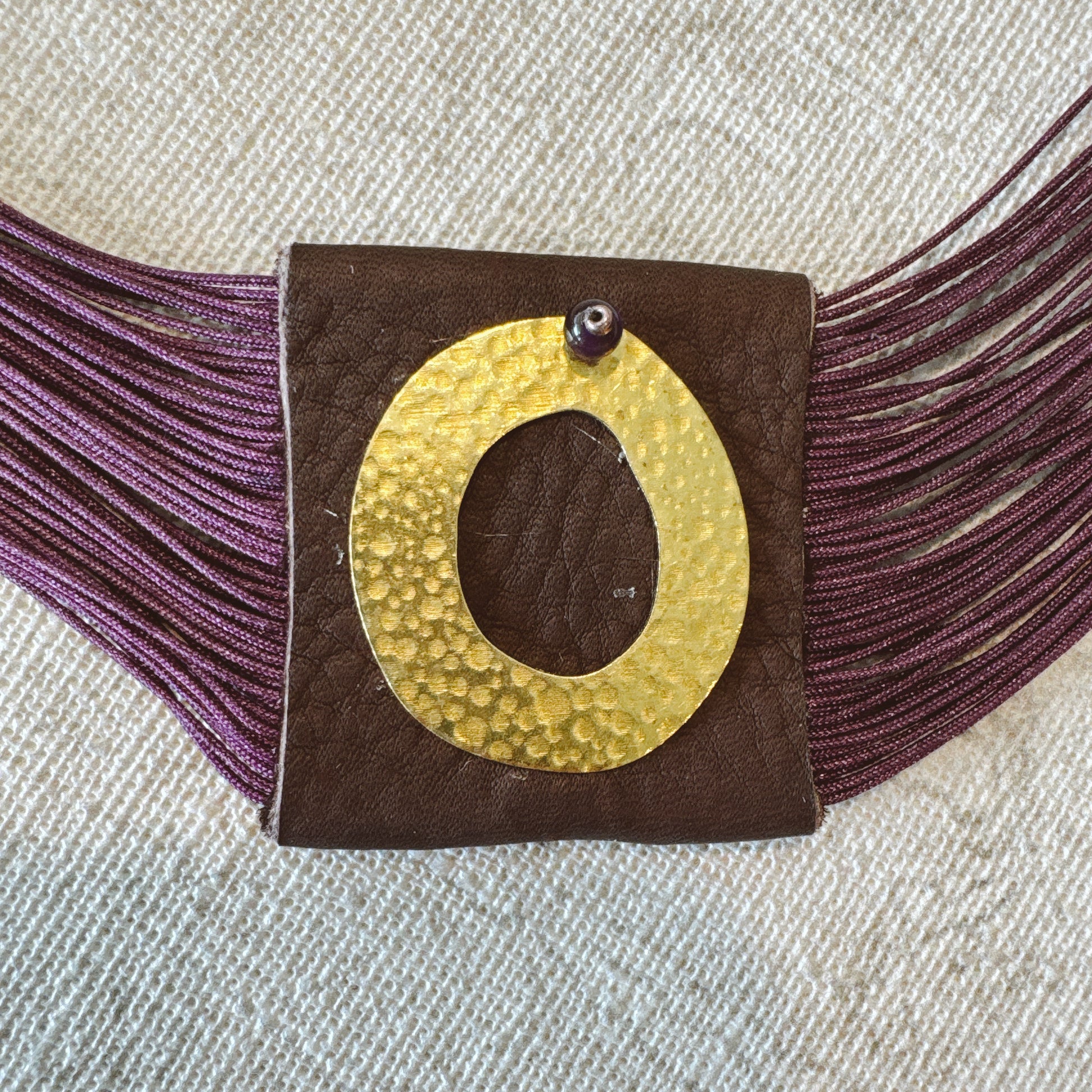 Tecnica: Hilos que abrazan cuero con un adorno metálico