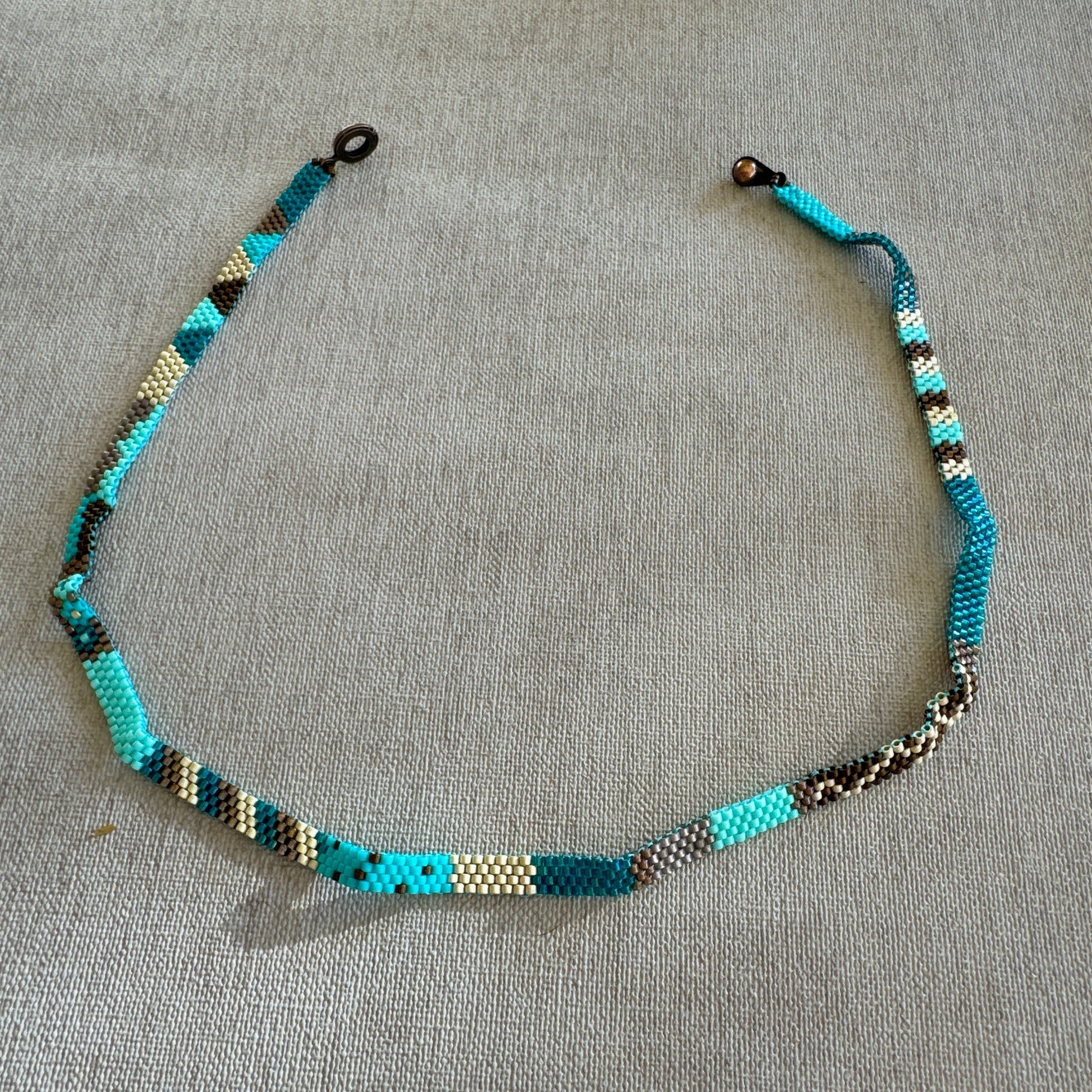 Collar tipo choker. Me encanta hacer este tipo de collares porque voy armando el diseño a medida que voy tejiendo. Y tal como lo dice el nombre, los colores evocan cielo y tierra.