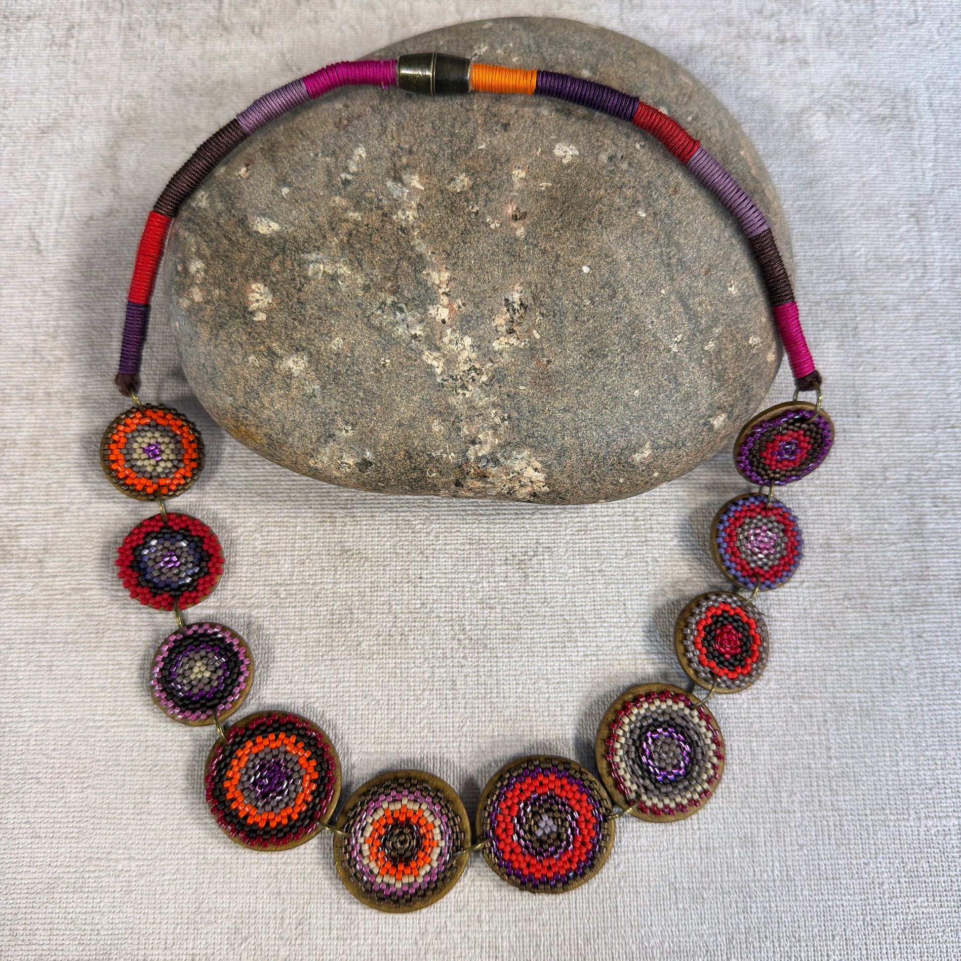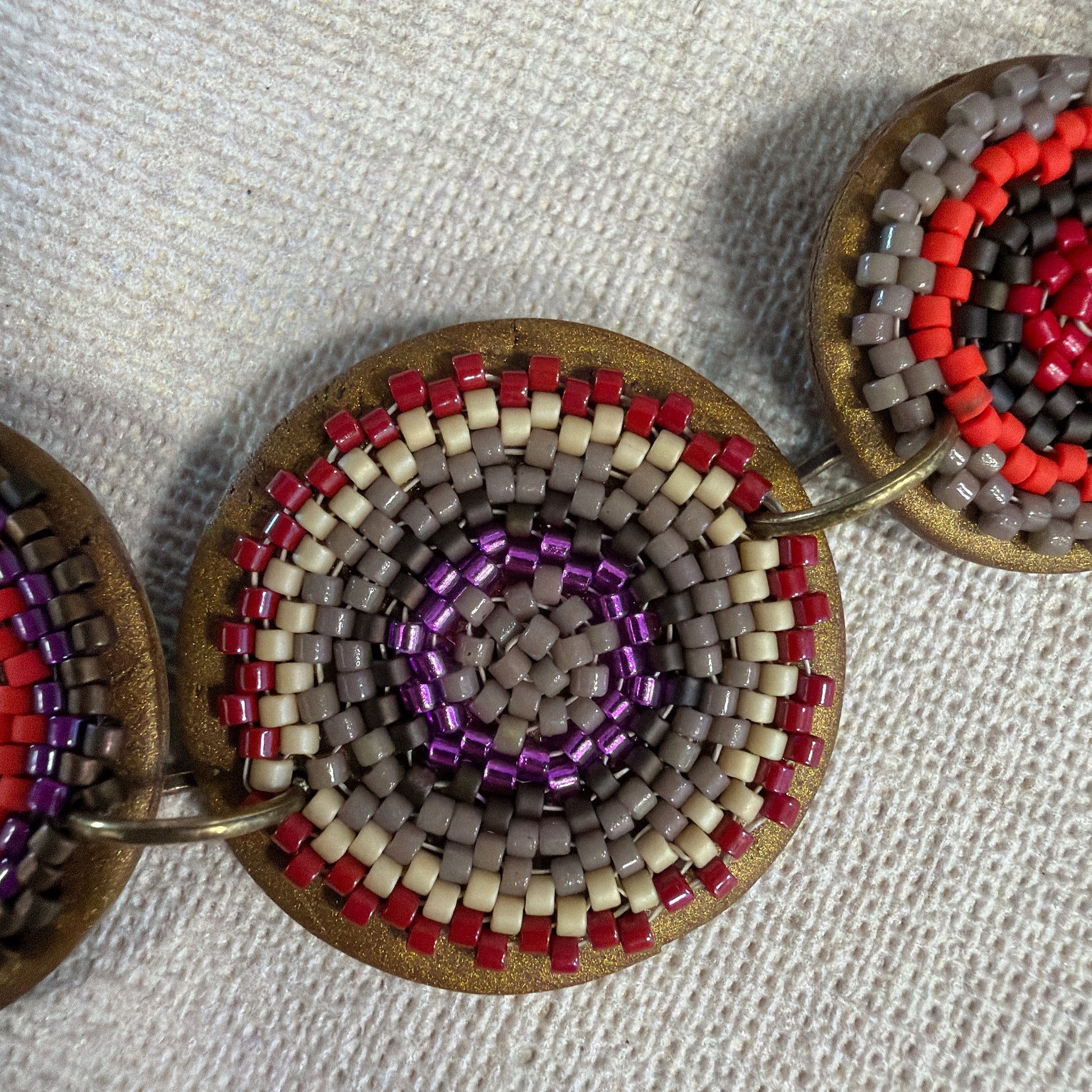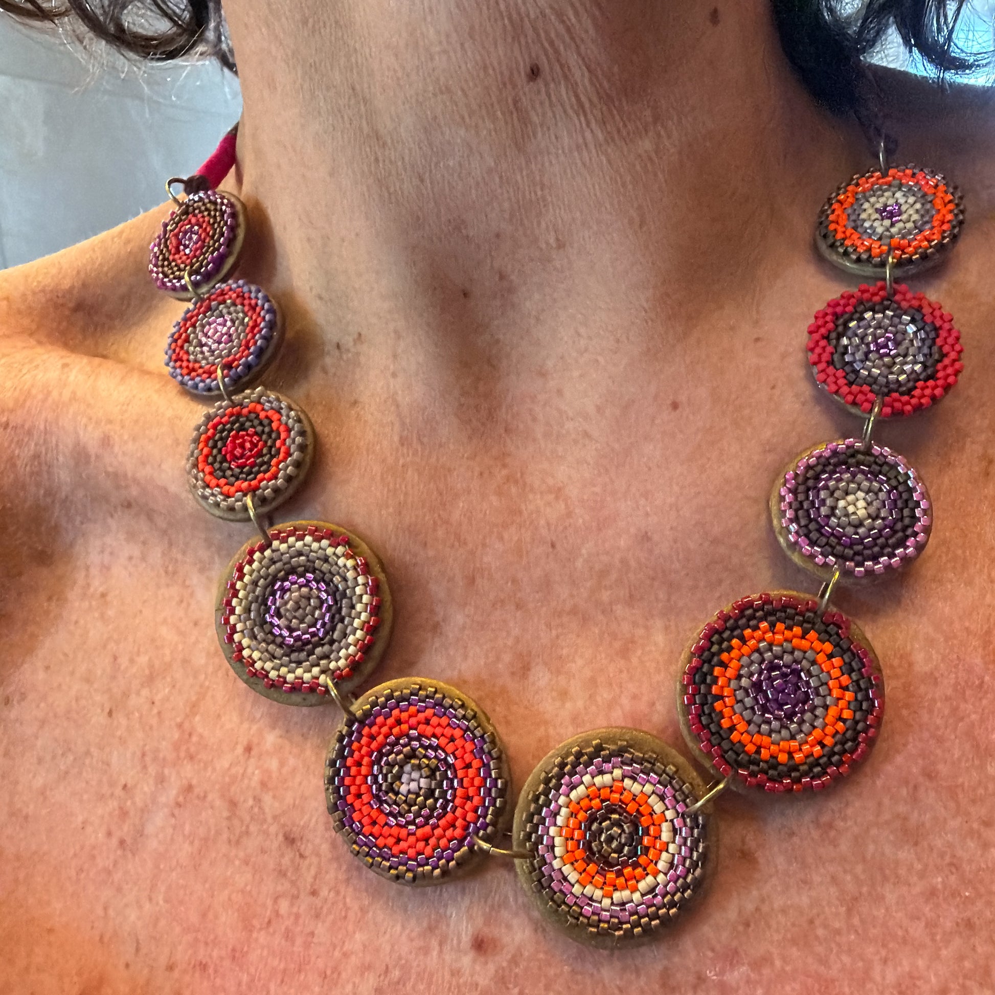 Cada pieza circular de este collar fue tejida con paciencia y ritmo, como si cada puntada repitiera un mantra de color. Las mandalas de mostacillas, ancladas en bases de arcilla polimérica, crean una danza cromática en tonos rojos, violetas, naranjas y rosados, con acentos neutros que equilibran la composición.
