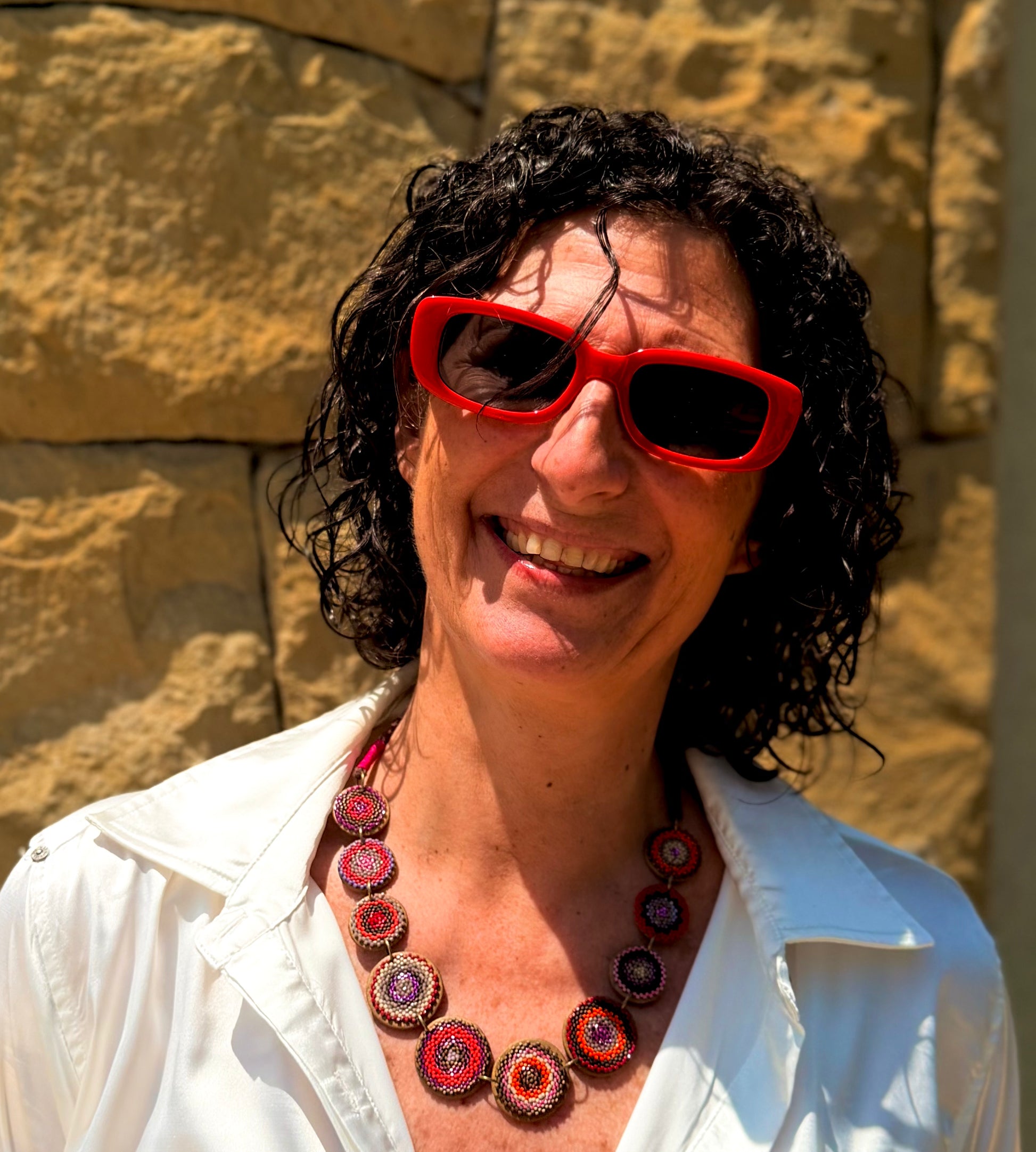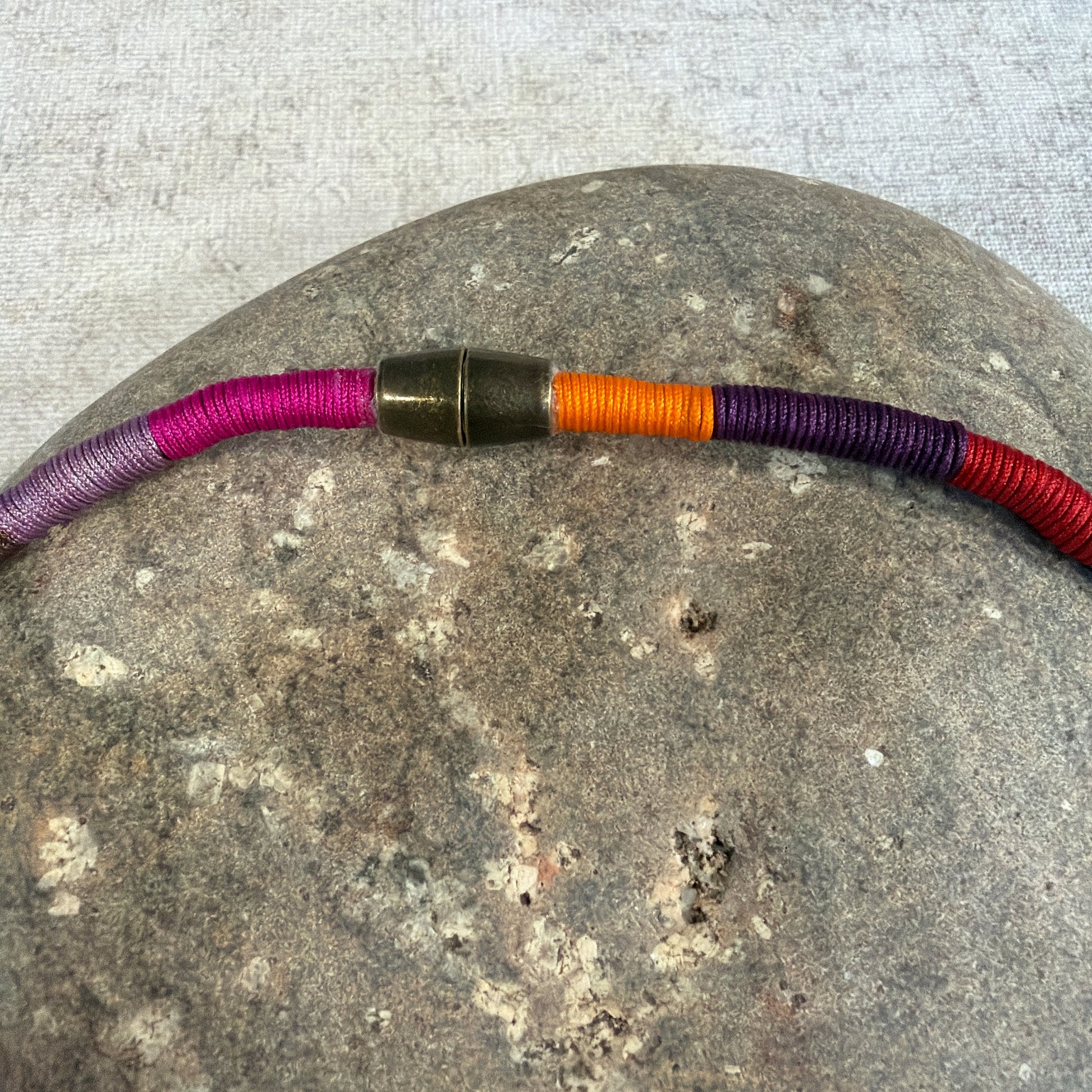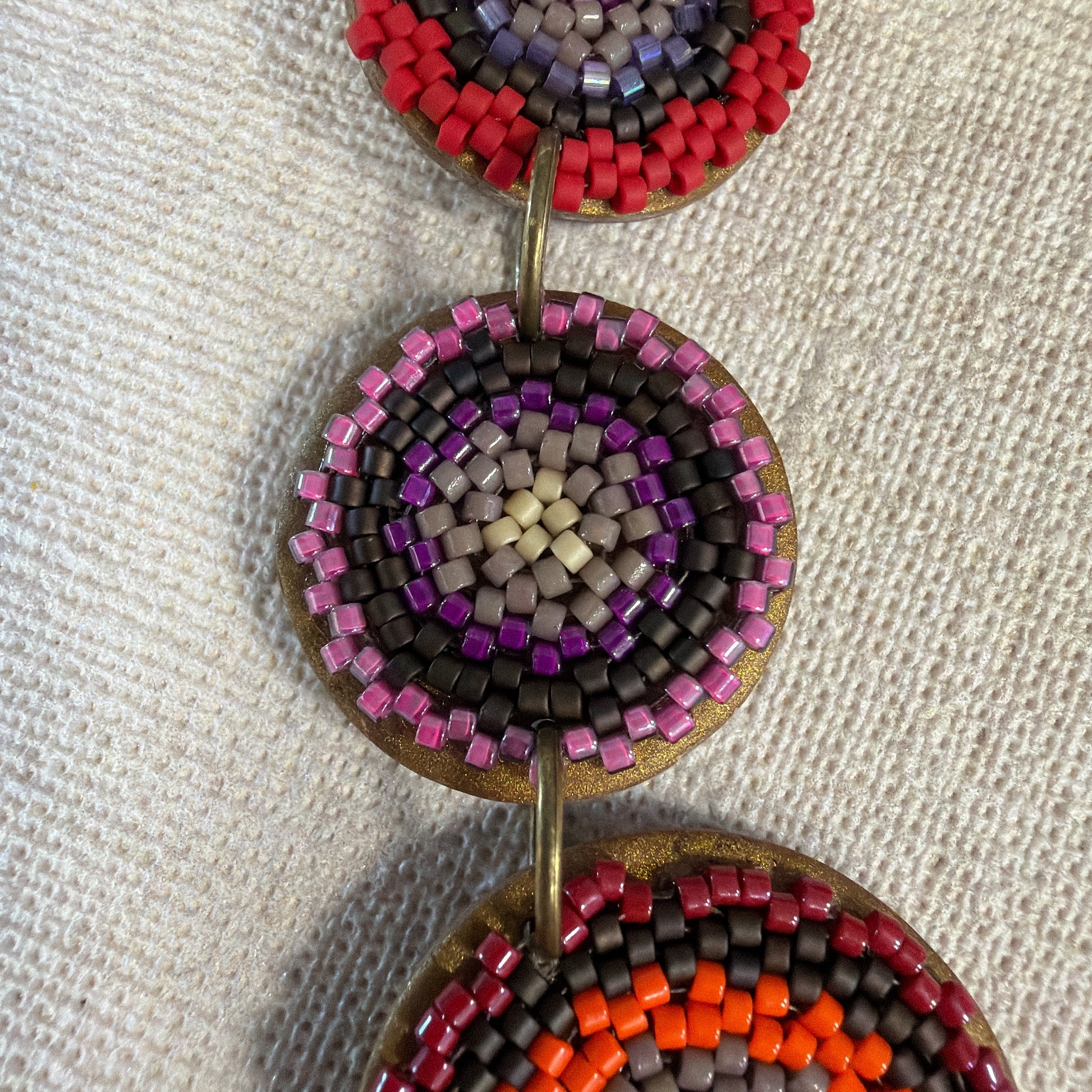 Cada pieza circular de este collar fue tejida con paciencia y ritmo, como si cada puntada repitiera un mantra de color. Las mandalas de mostacillas, ancladas en bases de arcilla polimérica, crean una danza cromática en tonos rojos, violetas, naranjas y rosados, con acentos neutros que equilibran la composición.