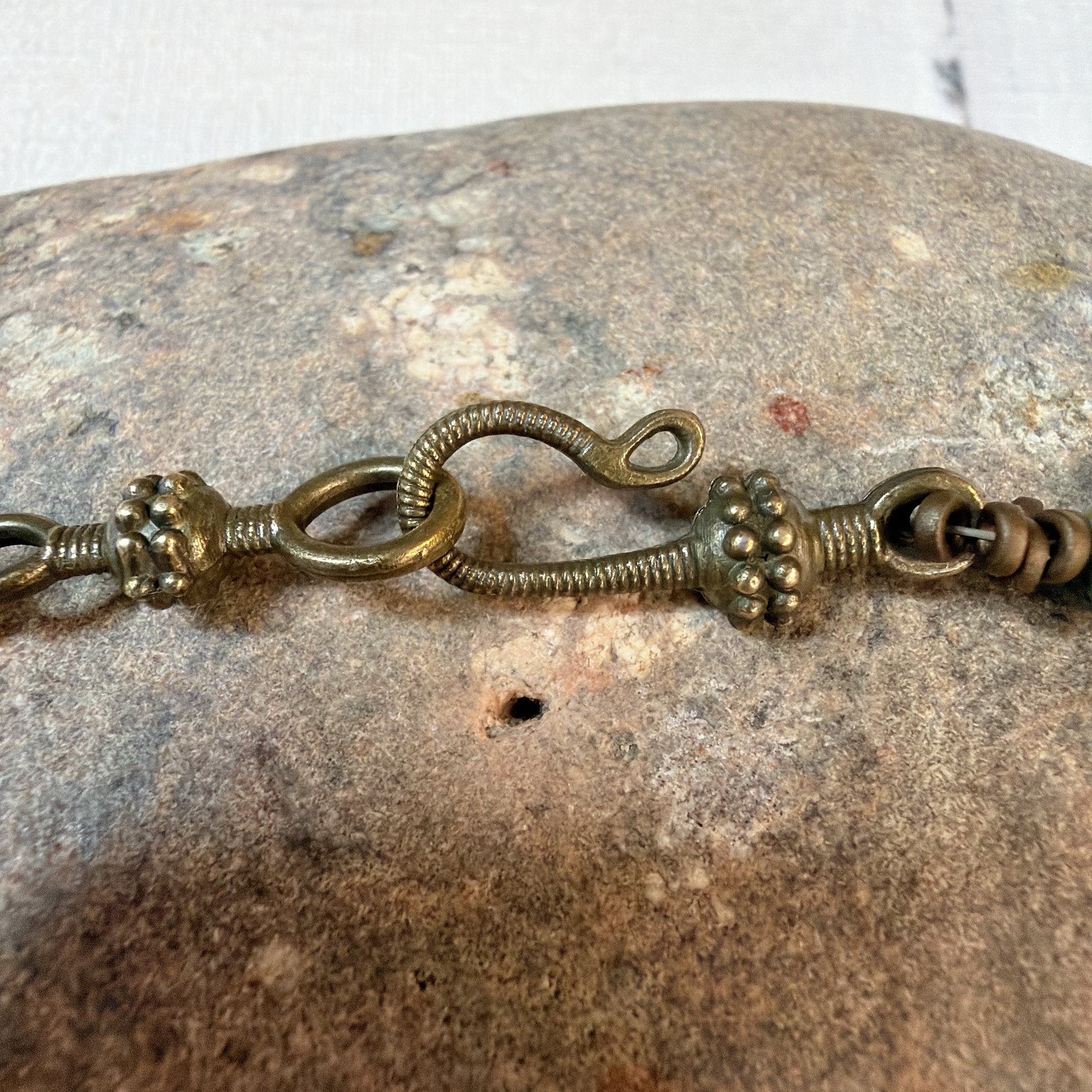 Este collar tiene una presencia muy marcada, con un diseño que mezcla lo ancestral y lo lúdico: círculos tejidos con mostacillas en tonos tierra, turquesas y verde limón, sobre base metálica de acabado envejecido. Las cuentas redondas a los lados suman fluidez con sus tonalidades minerales y algo acuáticas. Es una pieza con ritmo visual, texturas que invitan a acercarse y una vibra que conecta pasado y presente.
