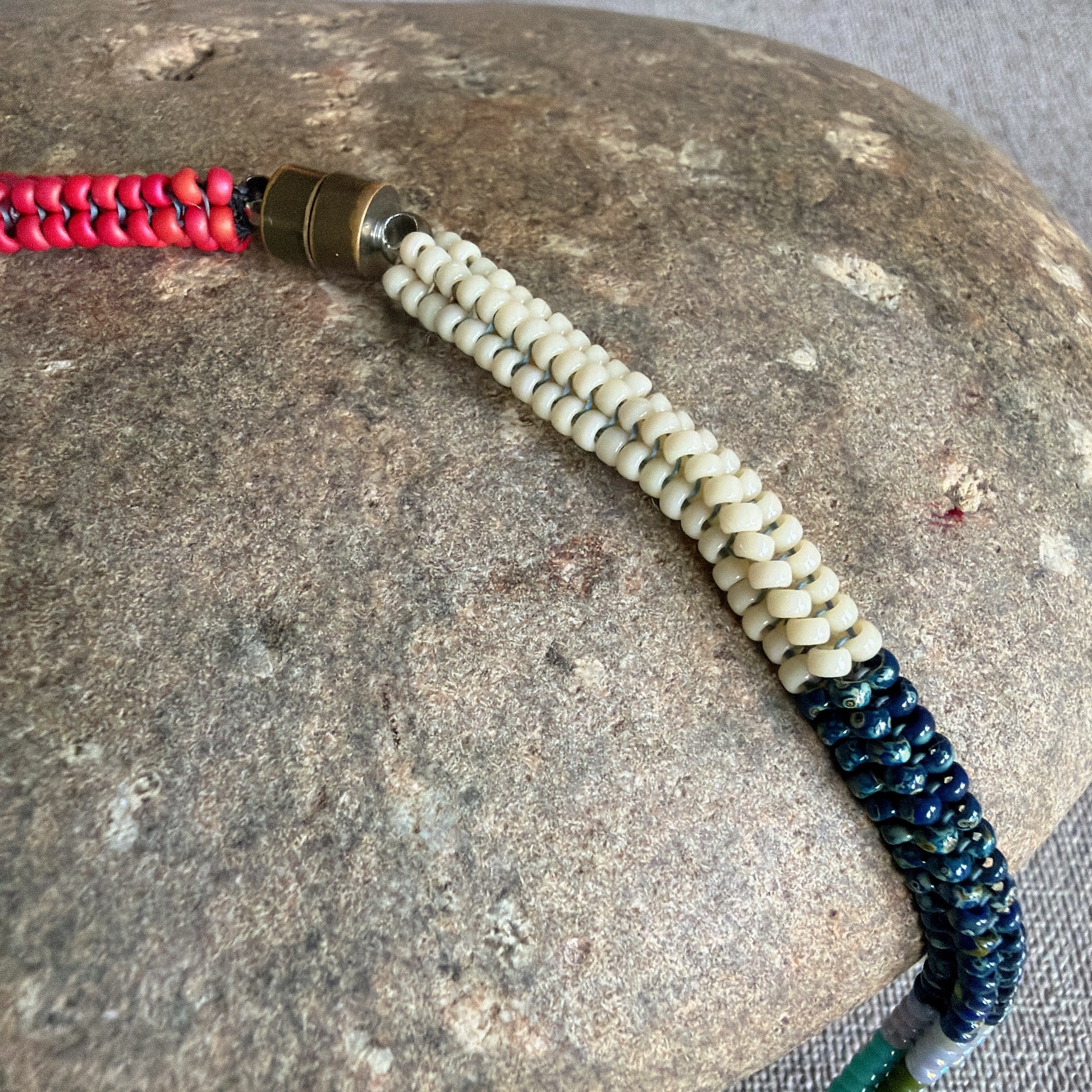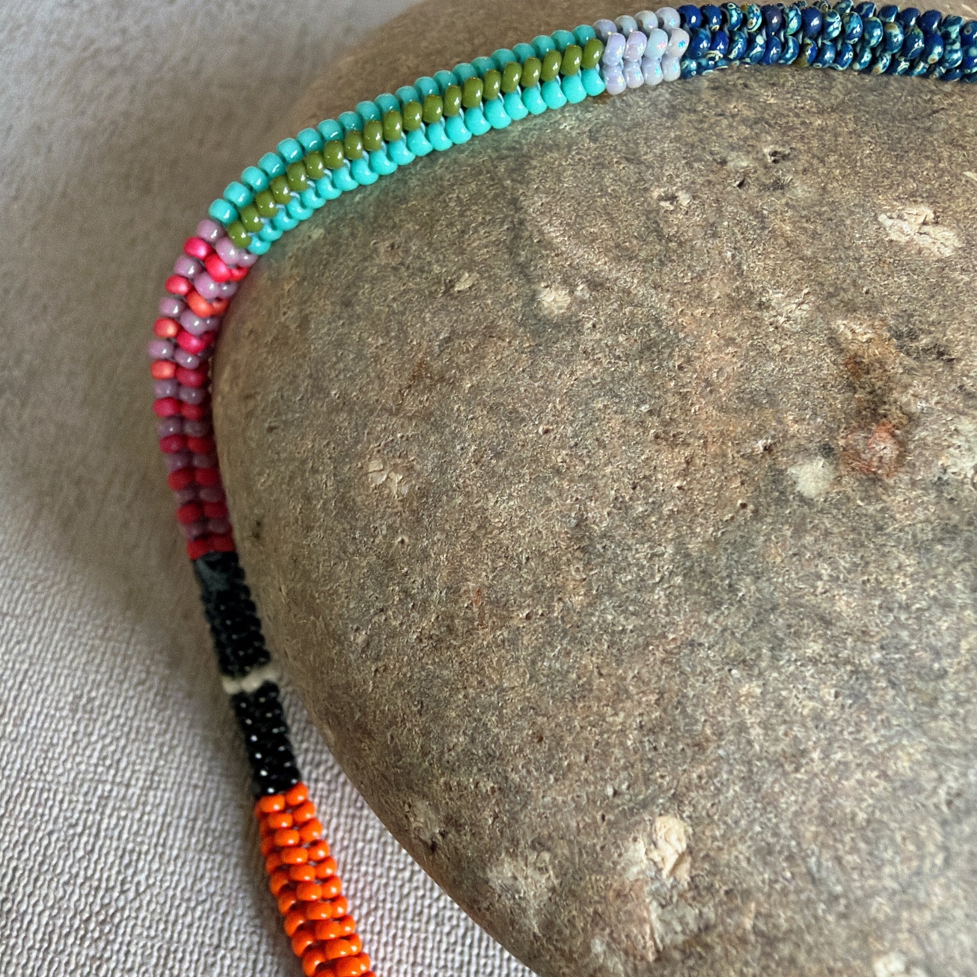 Este collar está tejido con mostacillas en una secuencia libre y cambiante, como un paseo entre piedras, musgos y cielos de distintas estaciones.