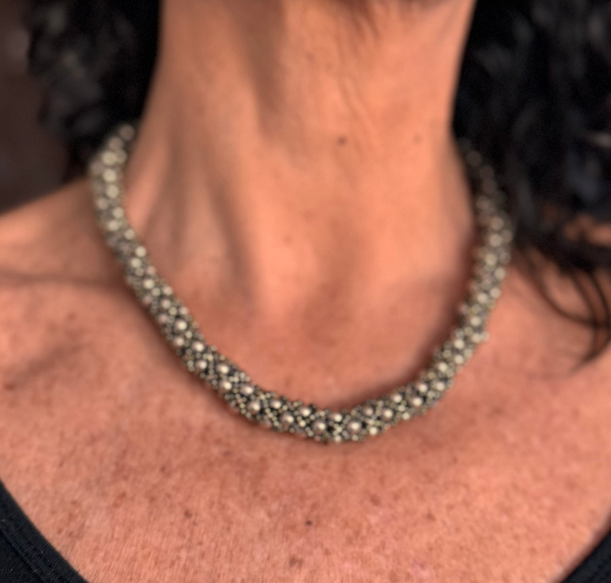 Este collar tubular tejido con mostacillas en tonos grisáceos y destellos metálicos es un clásico reinventado. Su textura acolchada y suave estructura en espiral le da cuerpo sin ser pesado, aportando elegancia y carácter. Ideal para acompañar tanto un look minimalista como uno más sofisticado, este diseño combina precisión técnica con una belleza sutil que atrapa a primera vista.