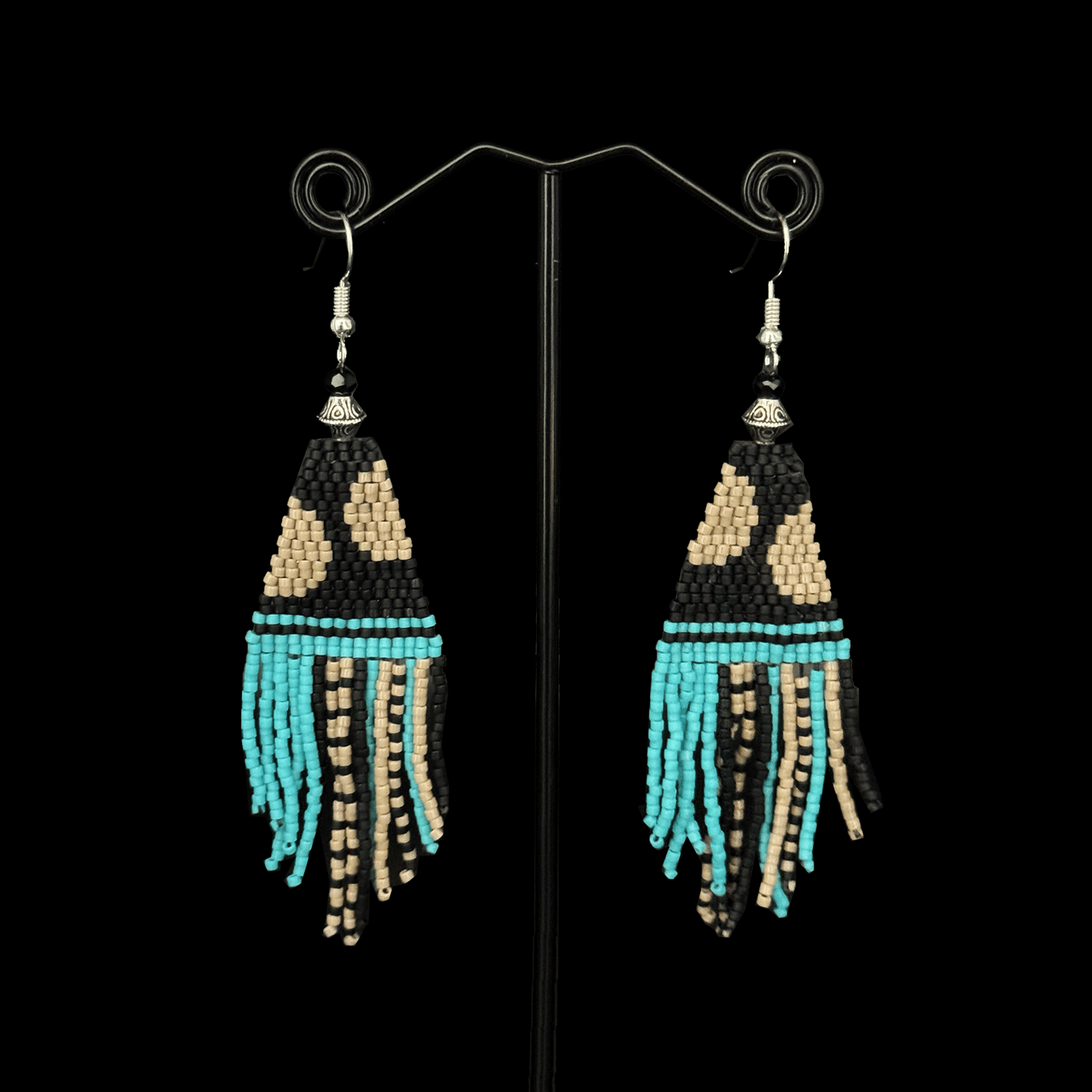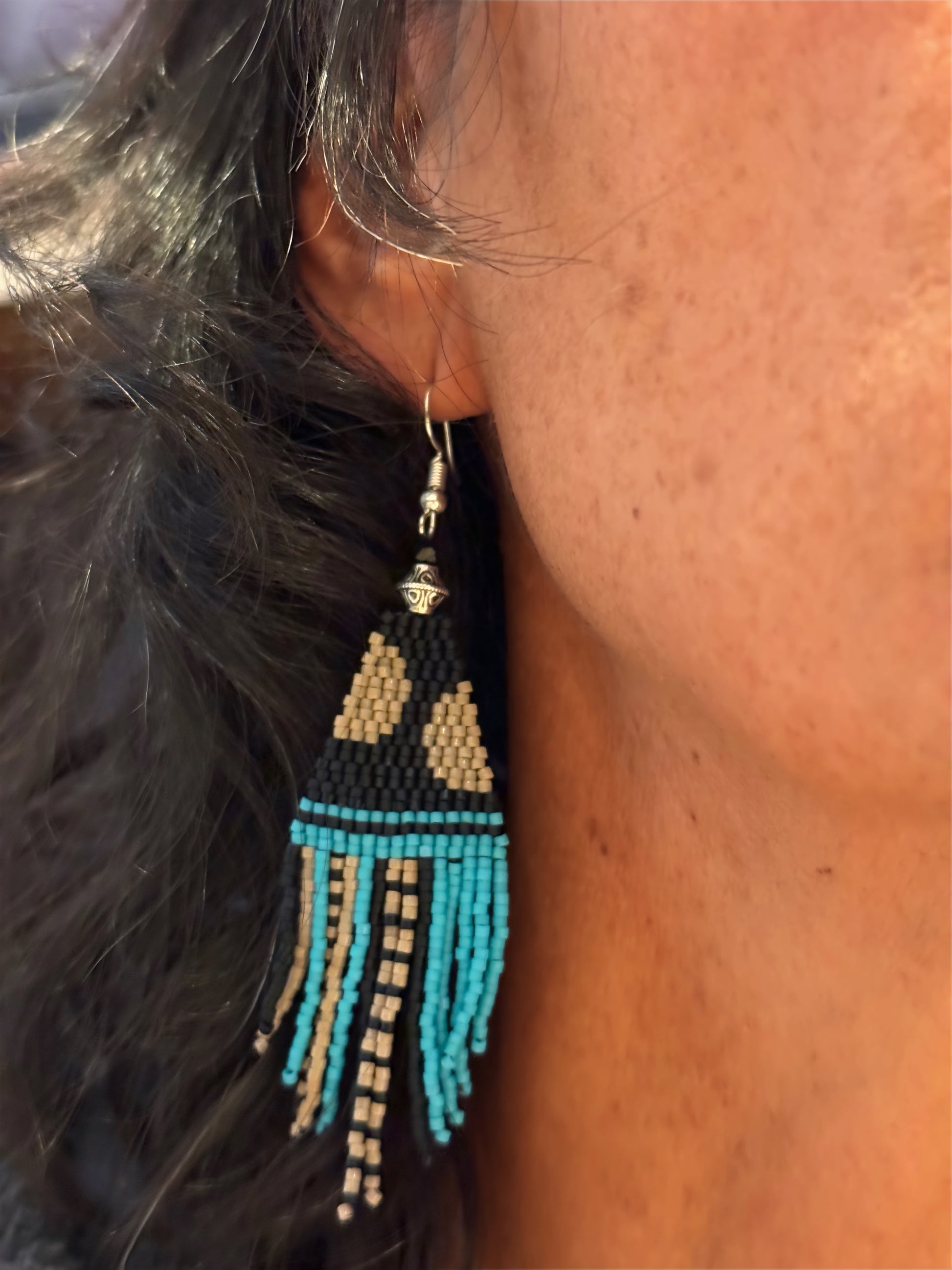 Con un diseño que combina líneas geométricas y colores vivos, estos aros hechos a mano con técnica brick doble son una declaración de estilo moderno y relajado. Las tiras de mostacillas le dan movimiento y ligereza, haciéndolos perfectos para el día a día.