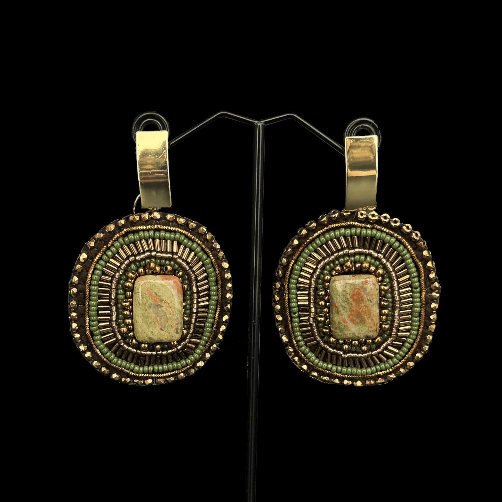 Una joya con presencia. Estos aros, bordados a mano con mostacillas y una piedra central protagonista, combinan el detalle del estilo barroco con la fuerza de los colores cálidos. Cada elemento fue pensado para transmitir elegancia, sofisticación y una belleza que impone.