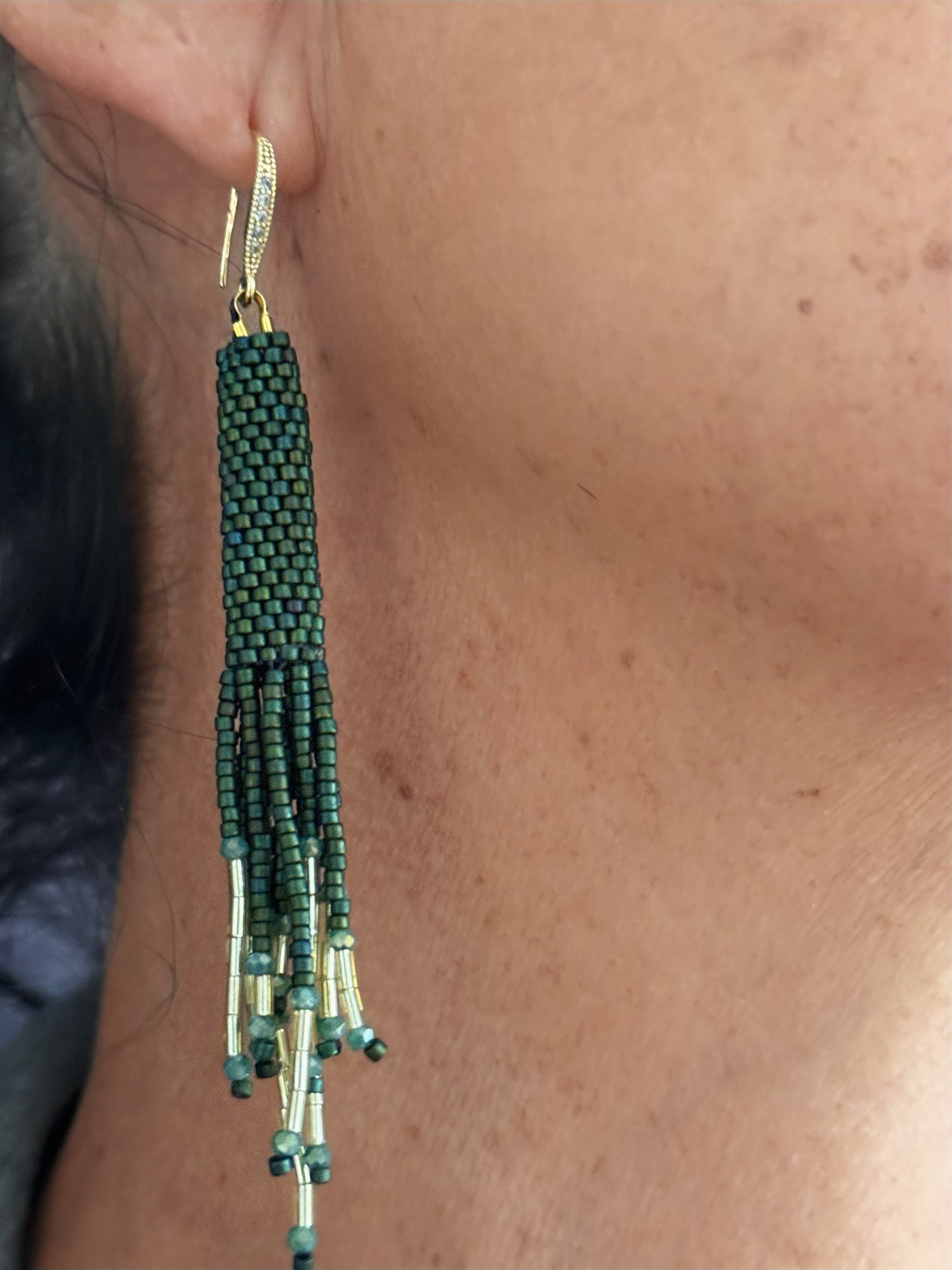 Hechos a mano con la técnica tubular en mostacillas Miyuki, estos aros caen con suavidad en flecos que aportan movimiento y ligereza. Su paleta en tonos cálidos los vuelve acogedores, versátiles y perfectos para usar en cualquier momento.