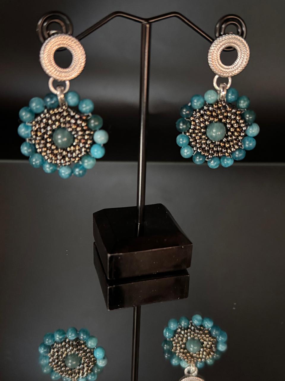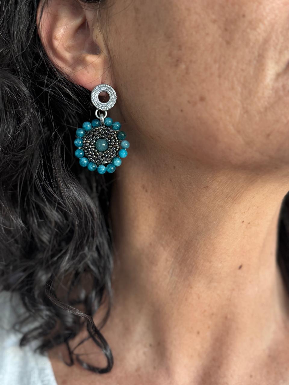 Aretes tejidos con precisión y carácter, donde el centro oscuro parece contener un secreto y las cuentas turquesa evocan la energía del mar en calma. Su diseño circular con relieve metálico aporta sofisticación sin rigidez: una joya que mezcla fuerza y frescura, ideal para quienes buscan una elegancia que se sienta libre.