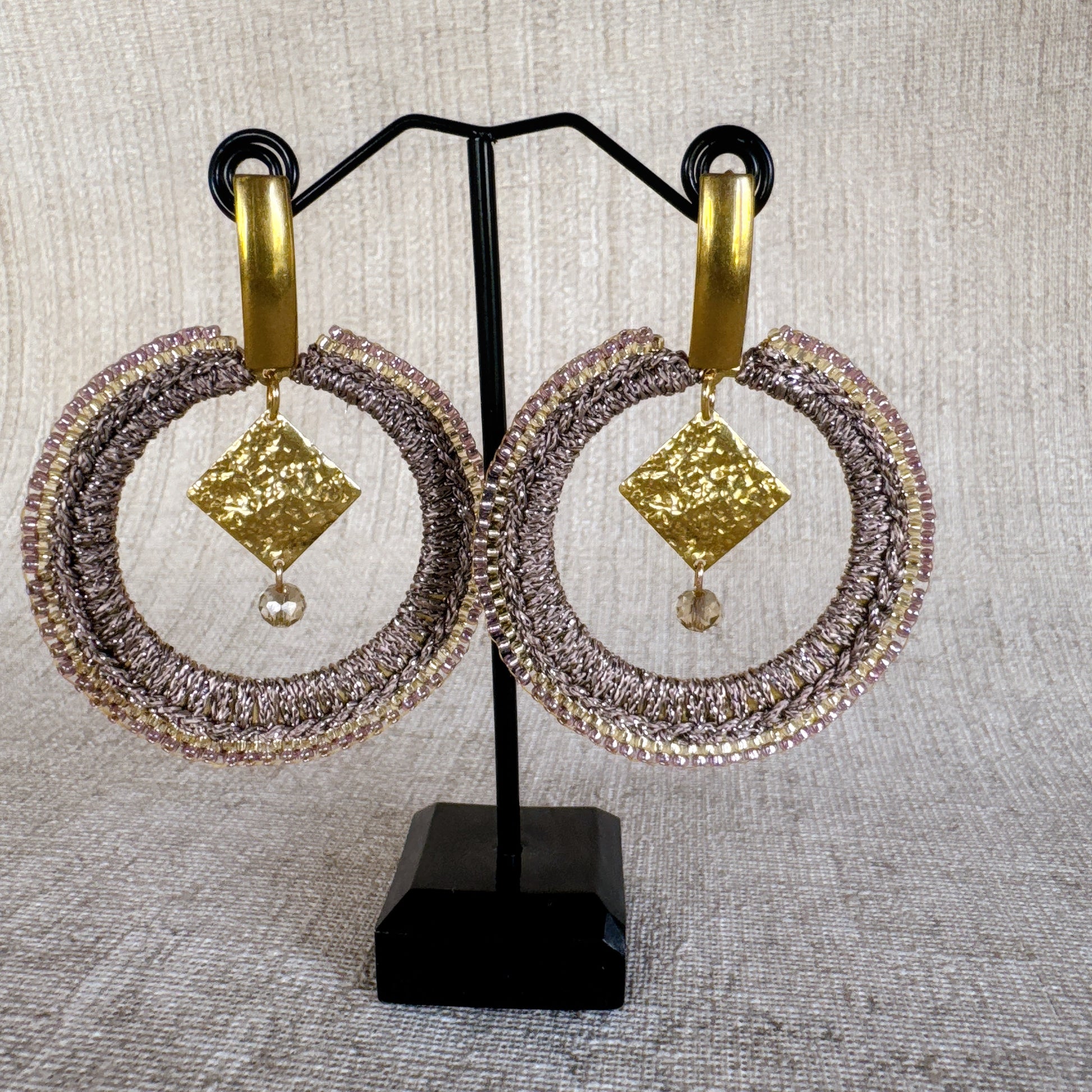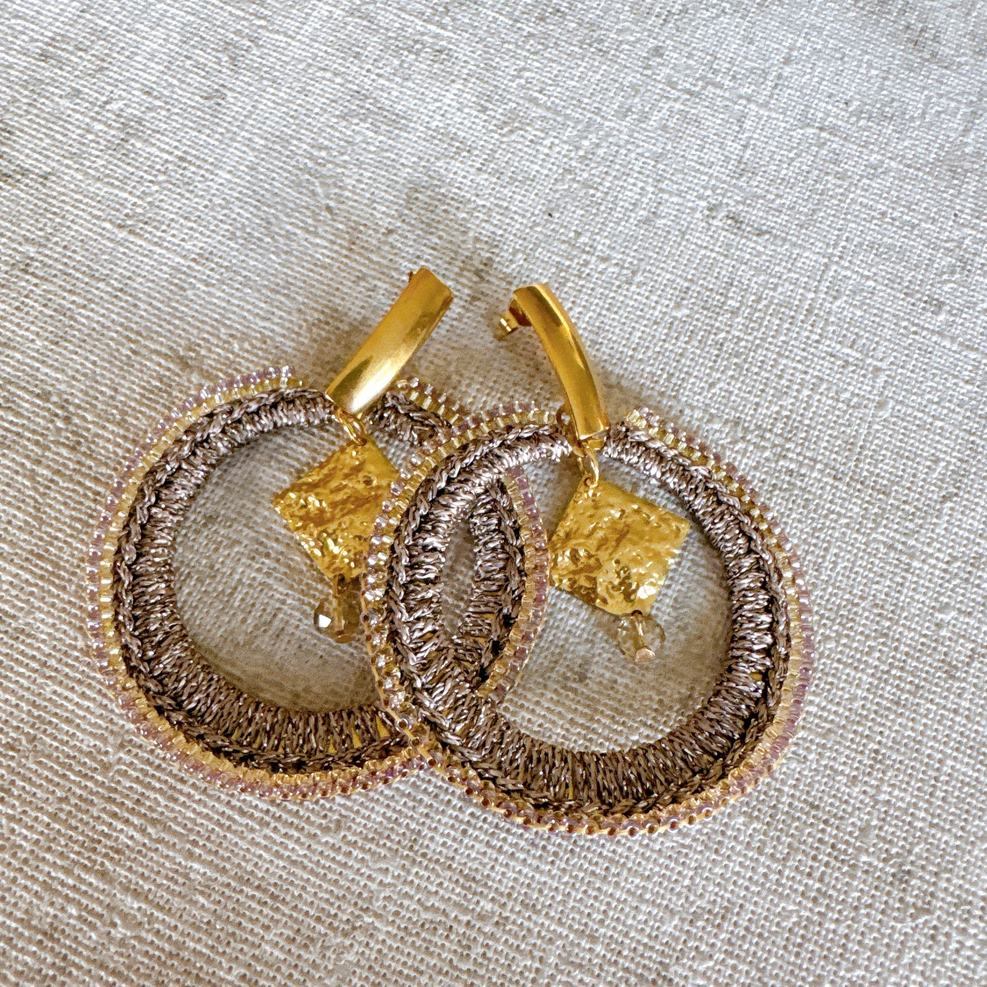 Técnica : Tejido en crochet con hilo sobre argolla de metal y tecnica ladrillo tejido en la base de hilo