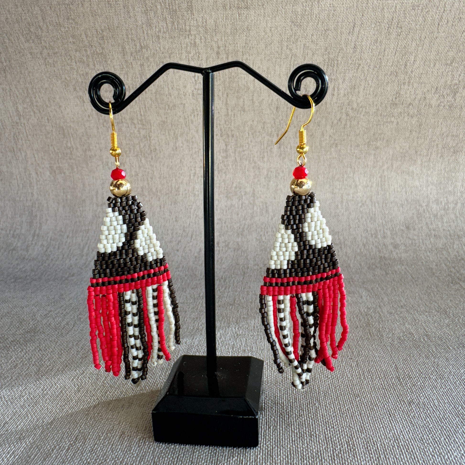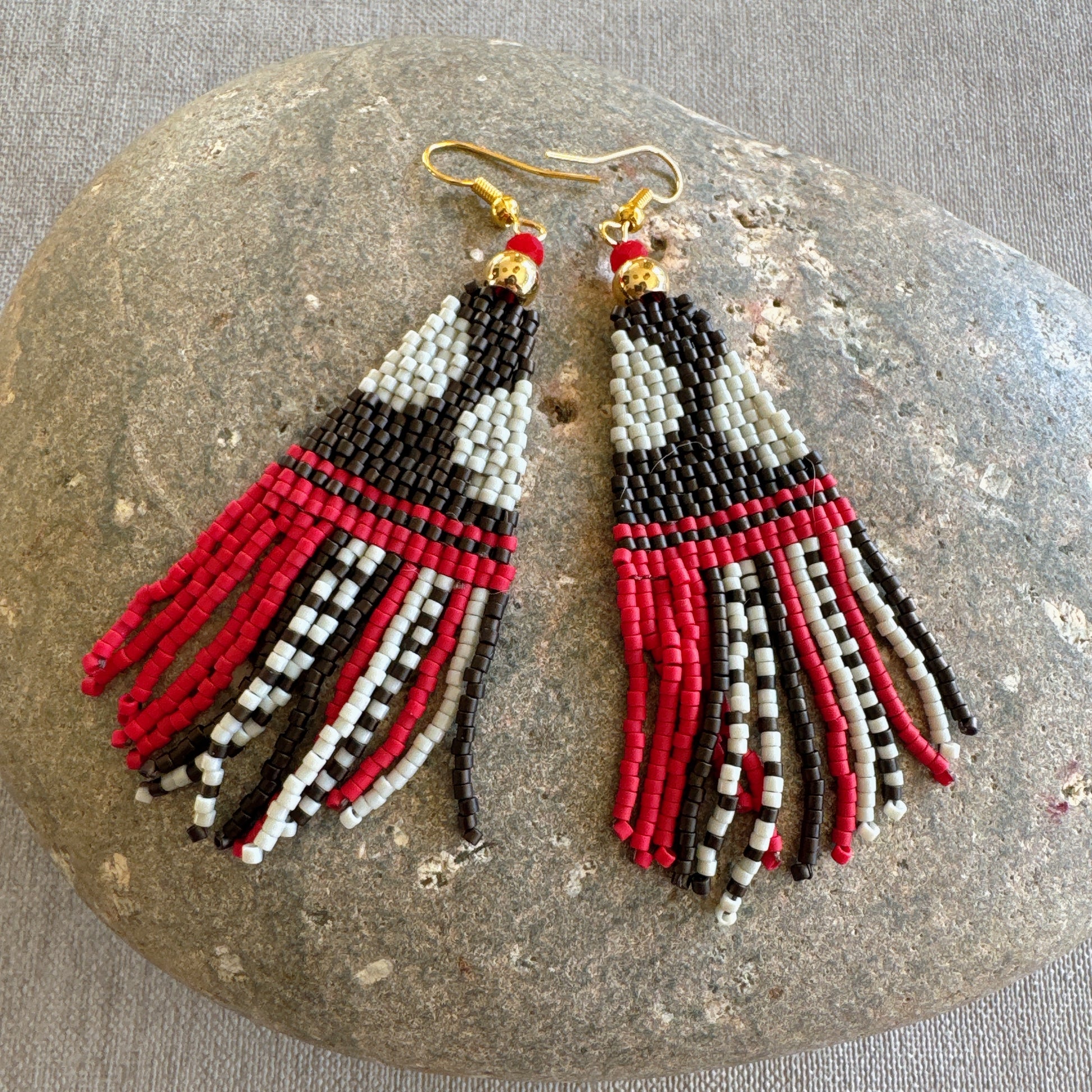 Con un diseño que combina líneas geométricas y colores vivos, estos aros hechos a mano con técnica brick doble son una declaración de estilo moderno y relajado. Las tiras de mostacillas le dan movimiento y ligereza, haciéndolos perfectos para el día a día.