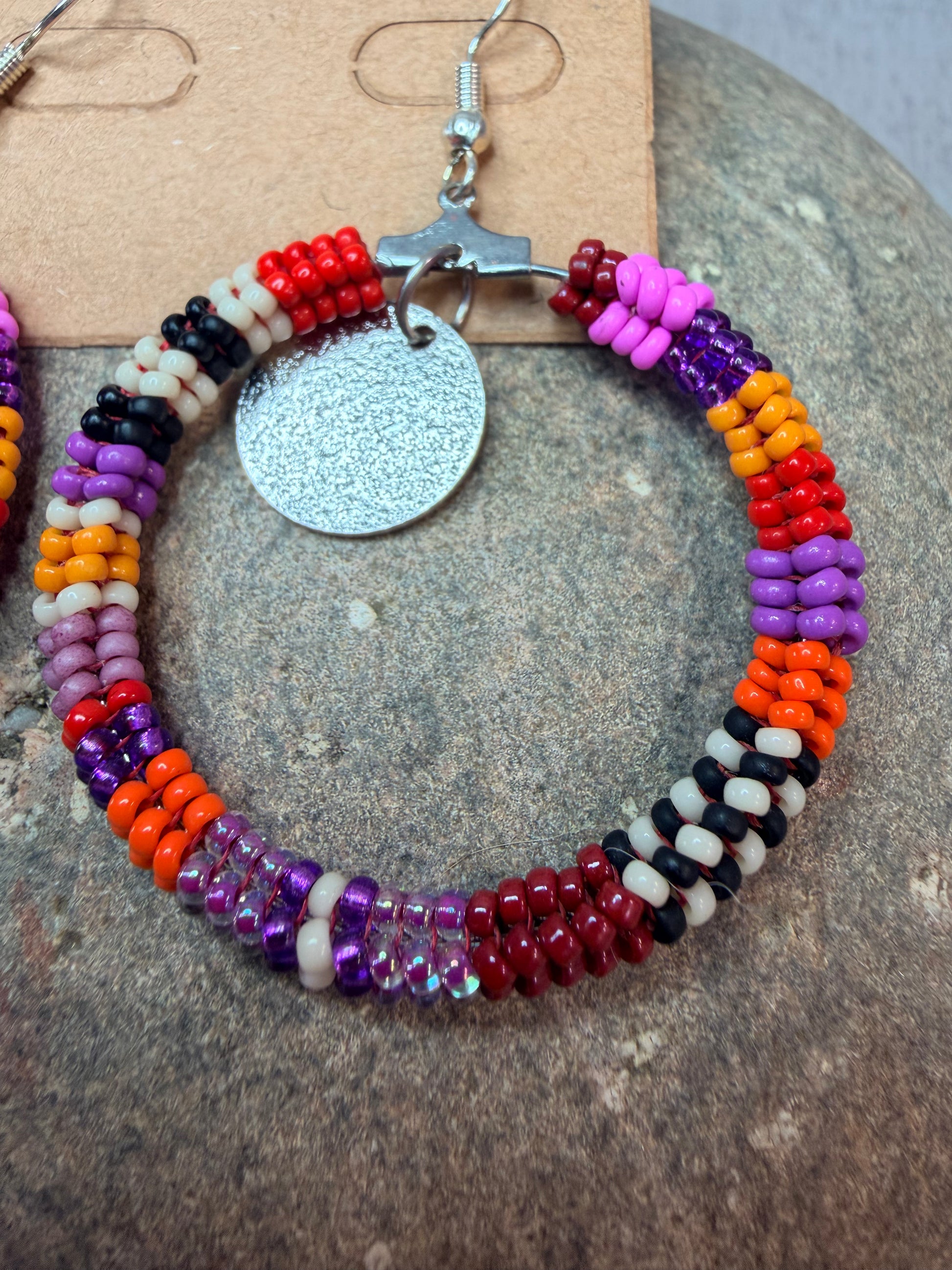 Estos aros están tejidos como una ronda que nunca se cierra del todo: un círculo en movimiento, lleno de pequeños encuentros. Los colores se suceden sin orden rígido —rojos, violetas, naranjos, negros y tonos crema— como fragmentos de un viaje, de una fiesta íntima o de una conversación larga que se estira en el tiempo.
