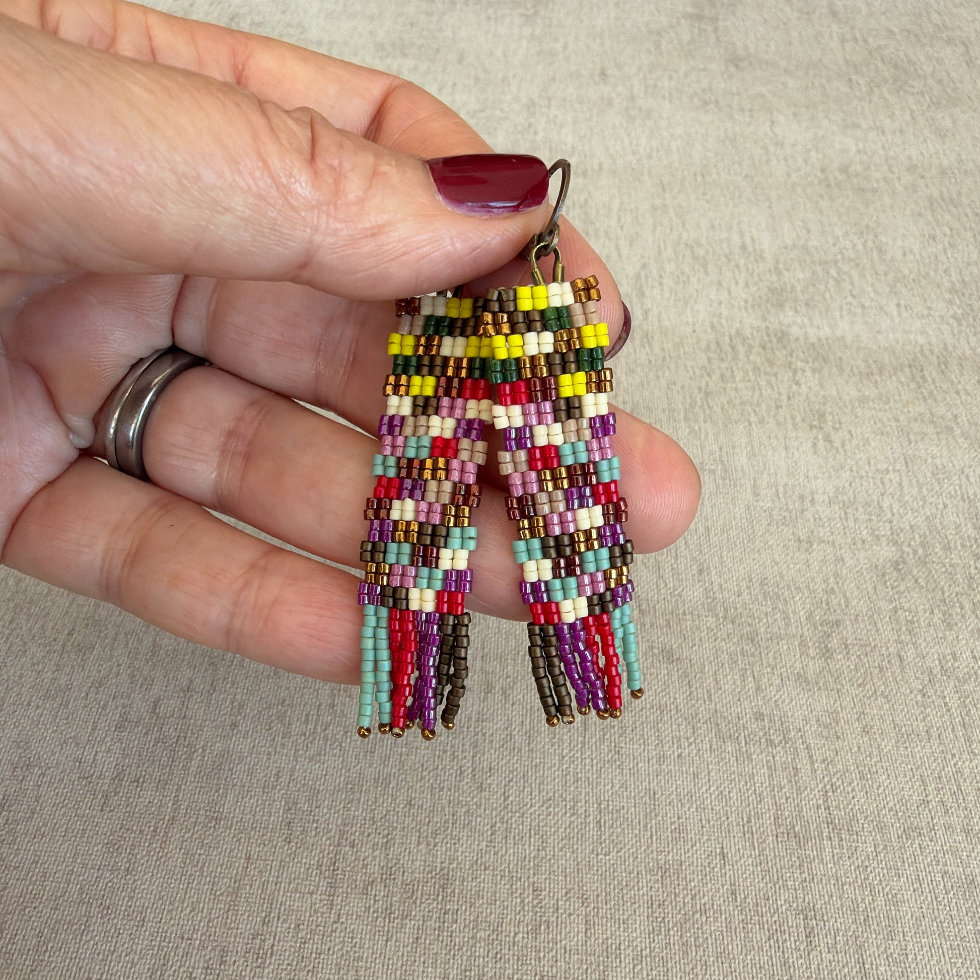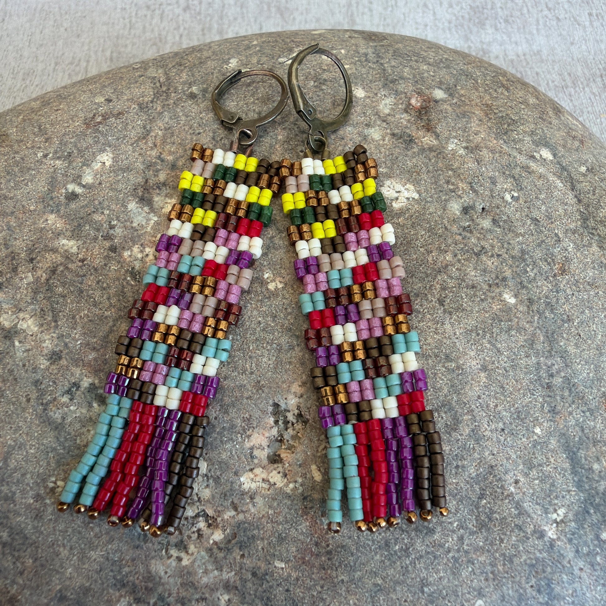 Estos aros tejidos con mostacillas en múltiples colores son una explosión de ritmo y energía contenida en forma vertical. Su diseño en franjas horizontales irregulares, con detalles metálicos, tonos cálidos, fríos y neutros, da una sensación de movimiento constante, como si bailaran incluso cuando están quietos.