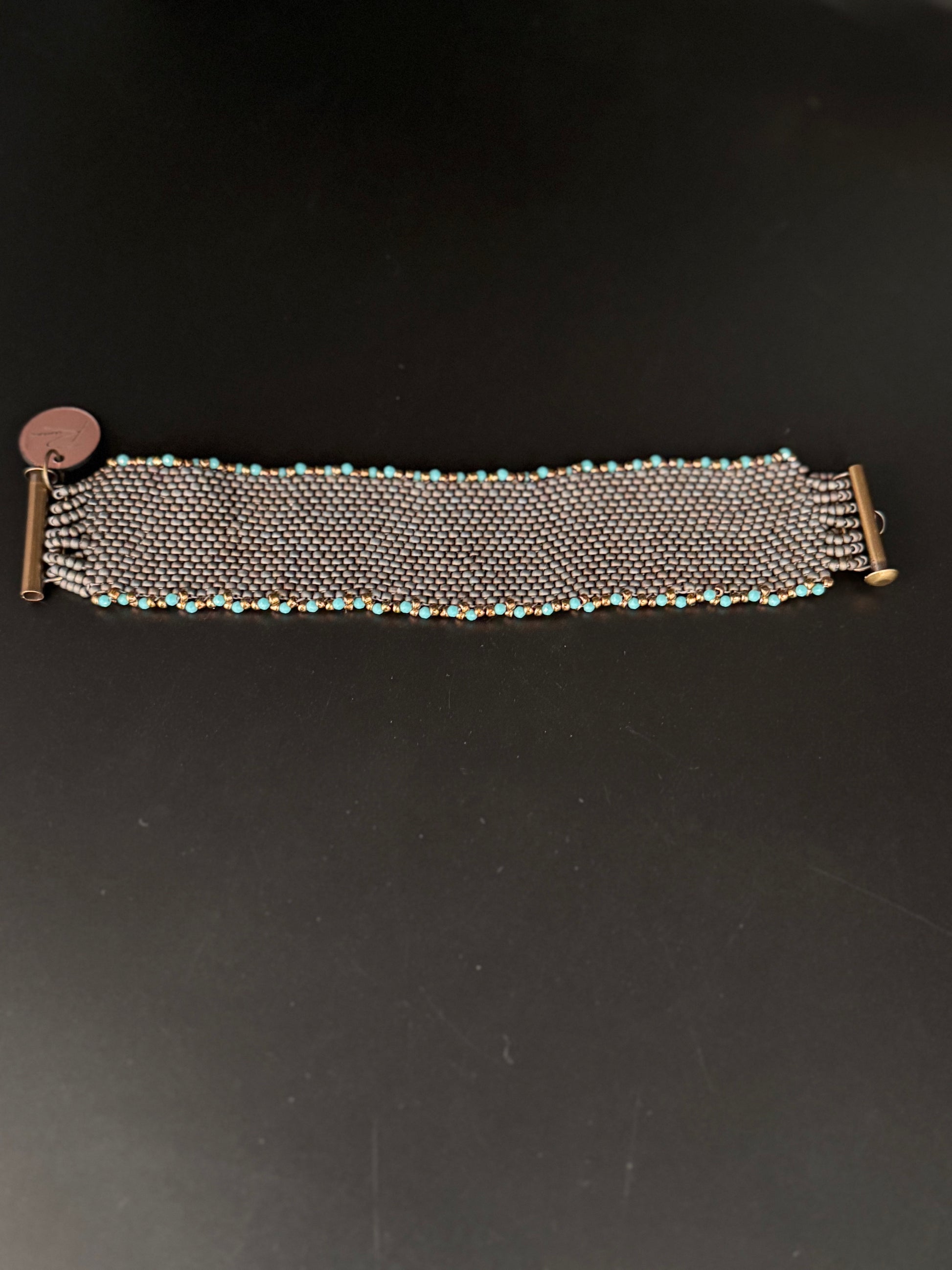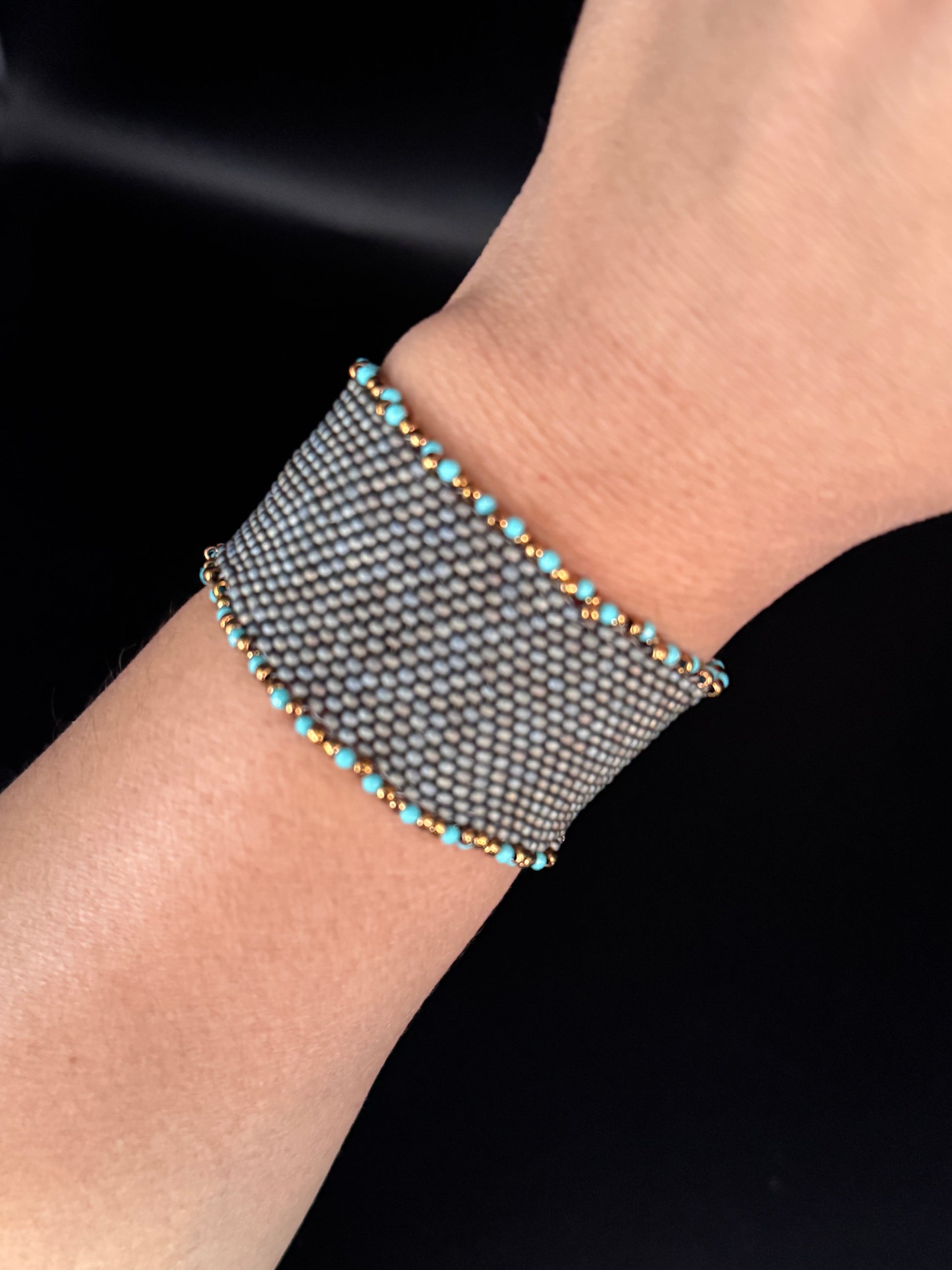 Pulsera ancha y flexible tejida en mostacillas metálicas gris plata, con un borde delicado de pequeñas cuentas turquesa y doradas. El diseño combina textura y uniformidad en el cuerpo principal, con un remate sutil que aporta luz, color y un contraste elegante.