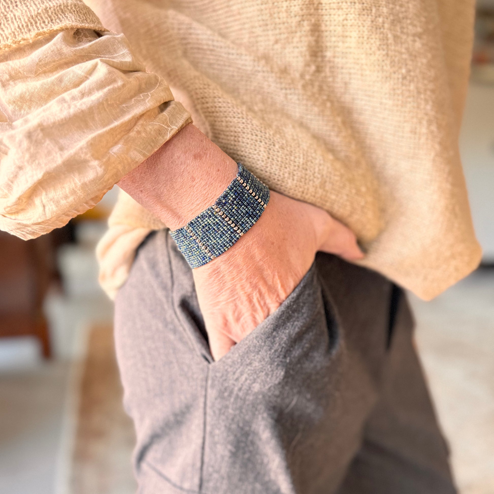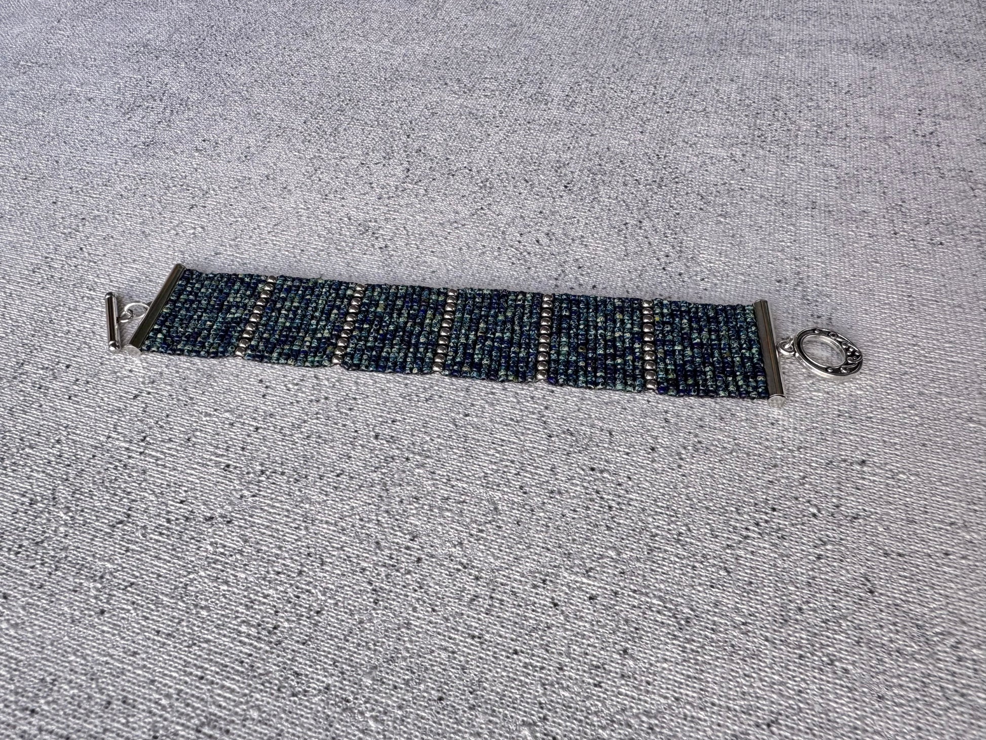 Pulsera tejida con mostacillas en tonos azul petróleo tipo picasso con tonalidades verdes, separada por delicadas líneas de mostacillas plateadas que crean un patrón moderno y estructurado. Es una pieza sobria, elegante y versátil, ideal para looks urbanos, minimalistas o de noche.