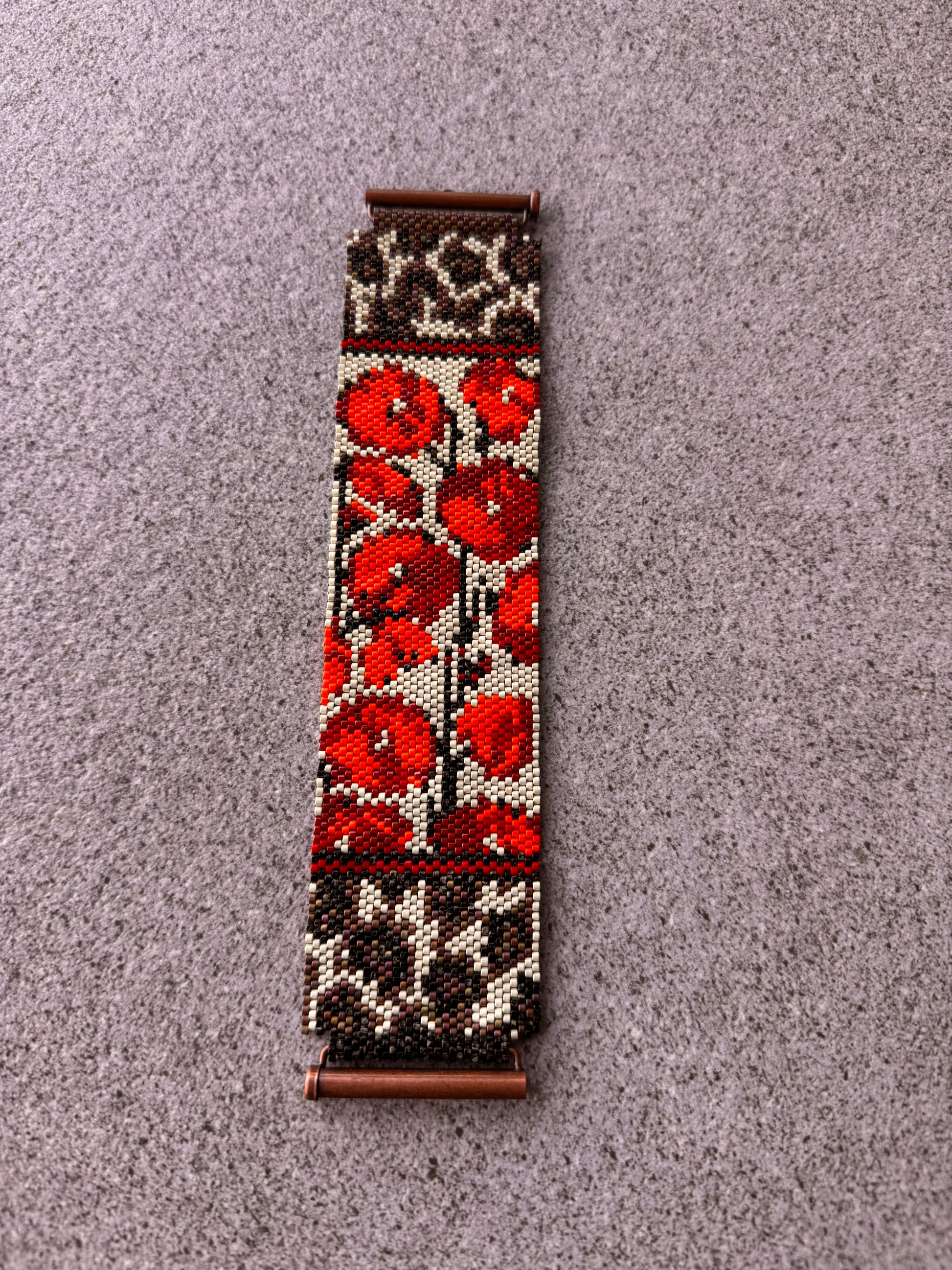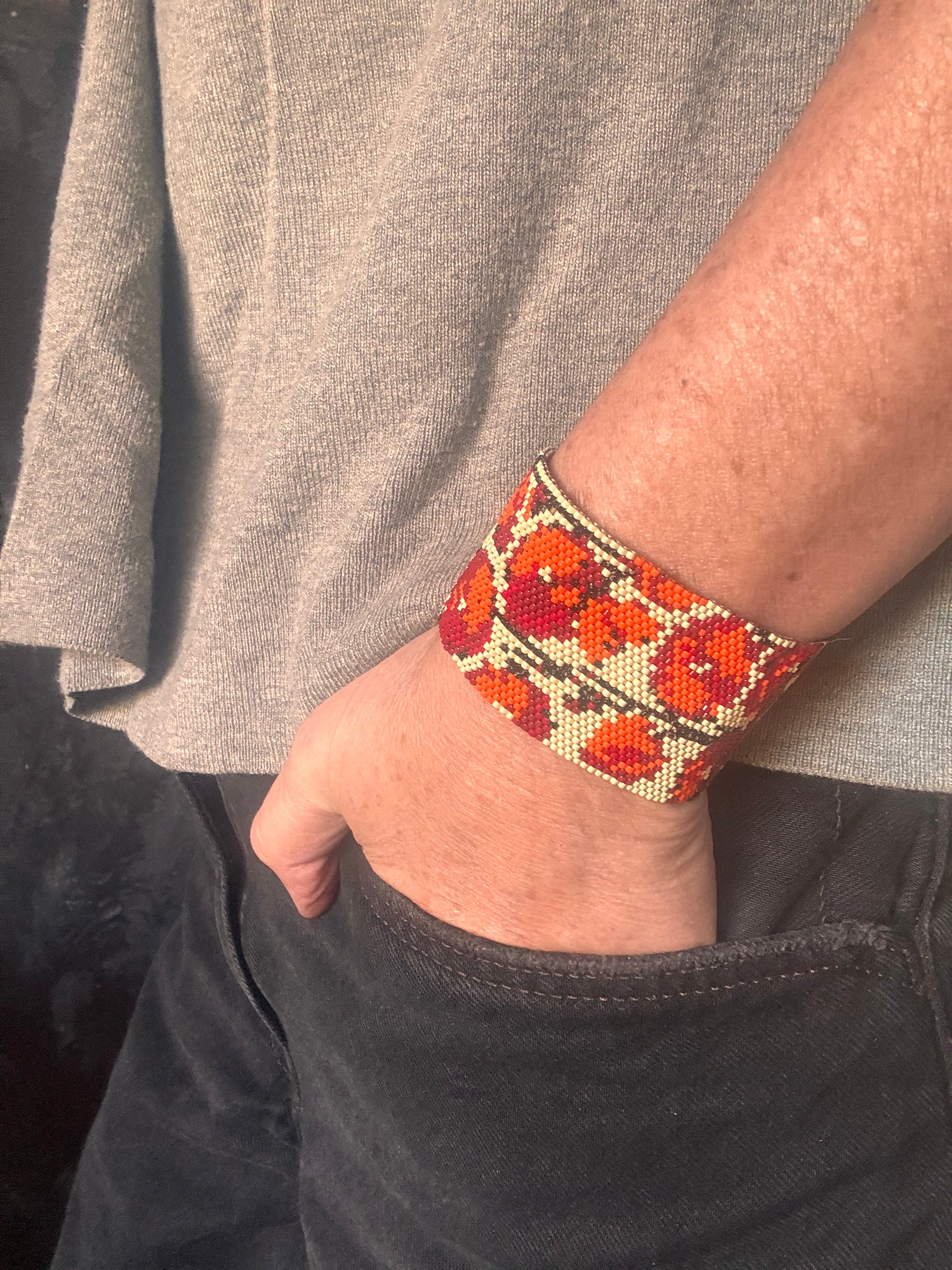 Pulsera tejida a mano con mostacillas Miyuki, donde conviven dos mundos: el estampado animal y el floral. Su diseño fusiona el carácter salvaje del leopardo con la calidez de amapolas rojas intensas, creando una pieza llamativa y llena de personalidad. El contraste de texturas y colores sobre fondo neutro permite que esta pulsera complemente tanto un look casual como uno más sofisticado. Un accesorio atrevido y cuidado en cada detalle, ideal para quienes se expresan a través del diseño.