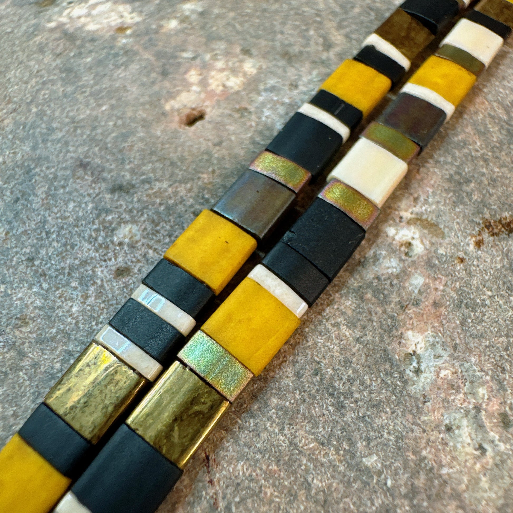 Esta pulsera está elaborada con tilas en tonos negro mate, blanco marfil, amarillo mostaza y reflejos metálicos dorados y bronce. El diseño en franjas alternadas crea un patrón geométrico moderno y sofisticado. Su cierre cilíndrico dorado aporta un aire elegante y robusto, mientras que los contrastes de color evocan fuerza y estilo urbano. Es una pieza versátil: combina con looks casuales aportando un toque distintivo y también con atuendos más elegantes como acento geométrico.