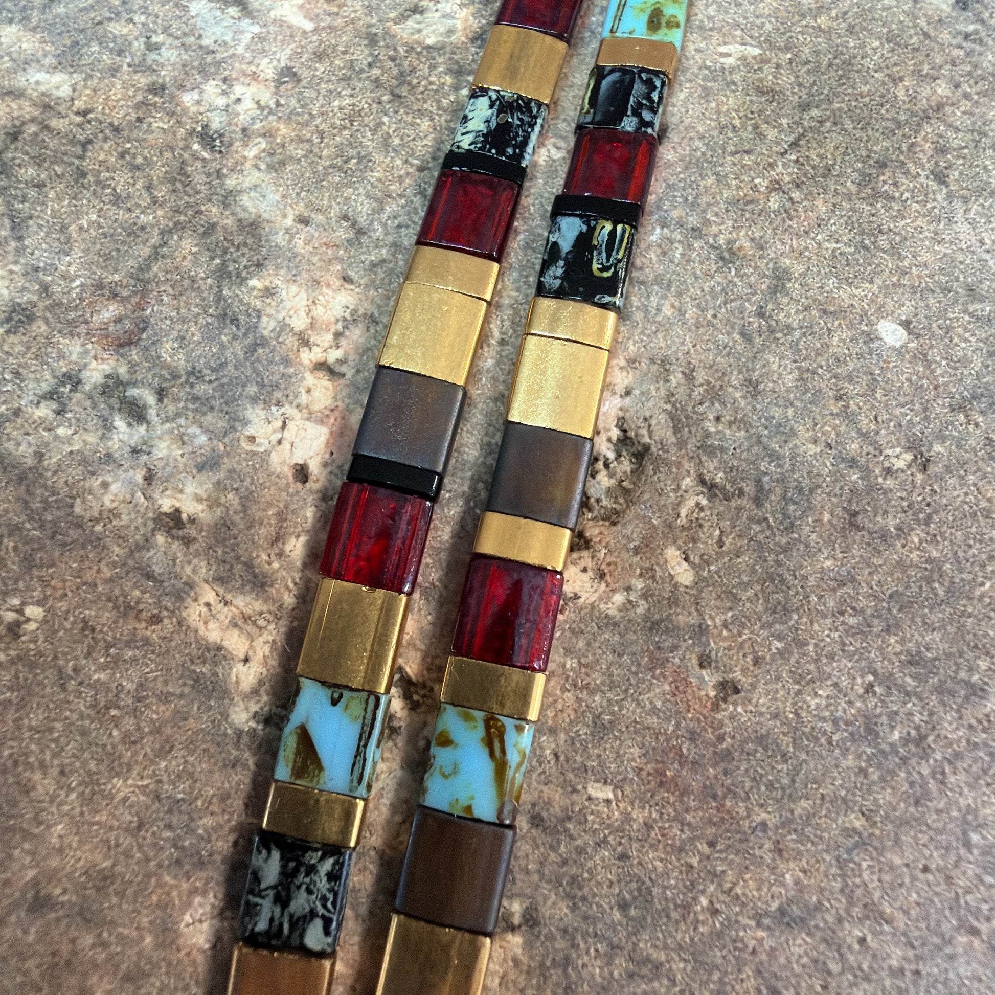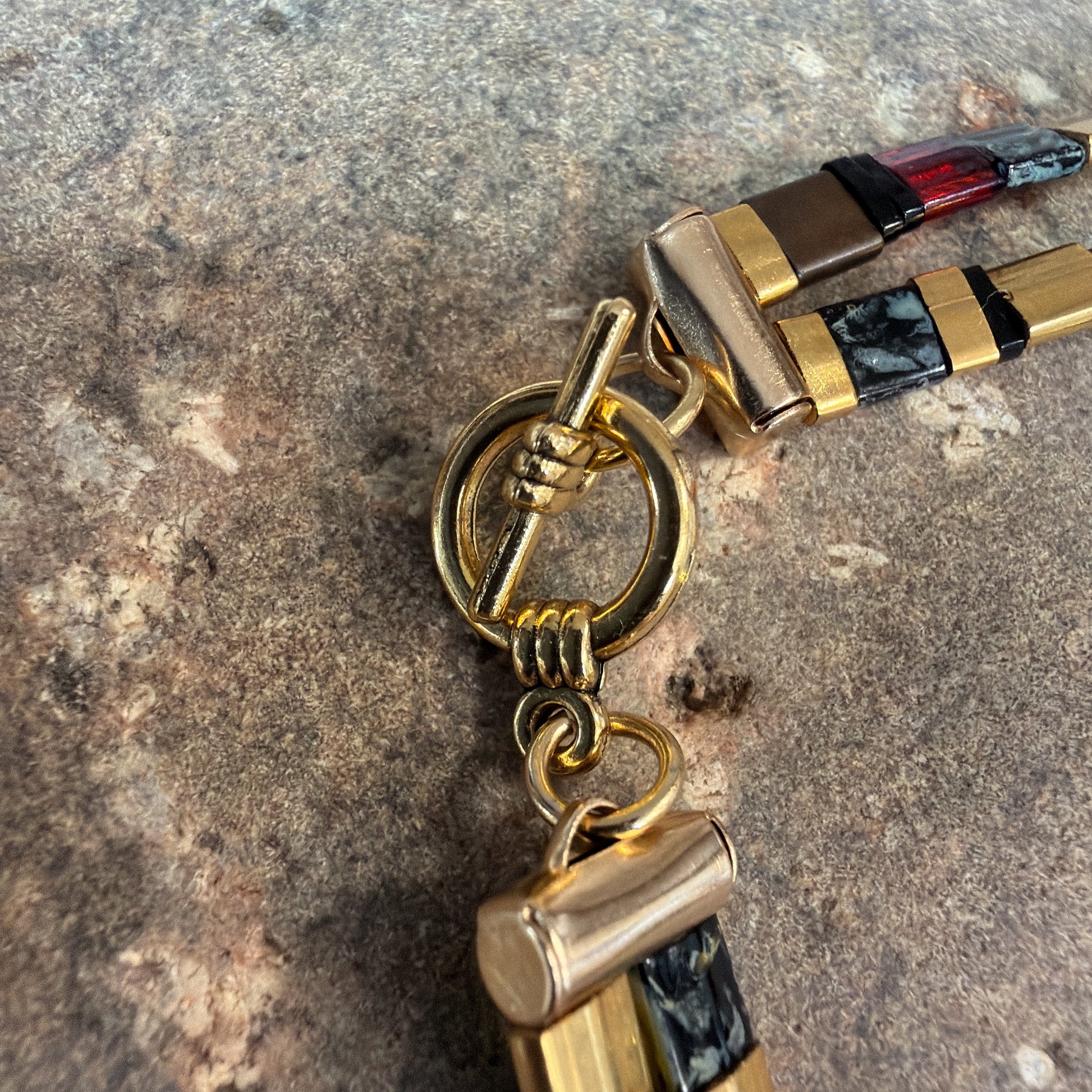 El diseño en franjas alternadas crea un patrón geométrico moderno y sofisticado. Su cierre cilíndrico dorado aporta un aire elegante y robusto, mientras que los contrastes de color evocan fuerza y estilo urbano. Es una pieza versátil: combina con looks casuales aportando un toque distintivo y también con atuendos más elegantes como acento geométrico.