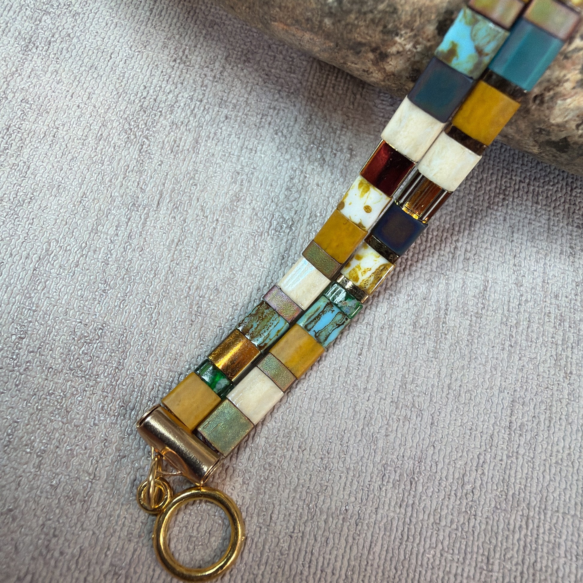 El diseño en franjas alternadas crea un patrón geométrico moderno y sofisticado. Su cierre cilíndrico dorado aporta un aire elegante y robusto, mientras que los contrastes de color evocan fuerza y estilo urbano. Es una pieza versátil: combina con looks casuales aportando un toque distintivo y también con atuendos más elegantes como acento geométrico.