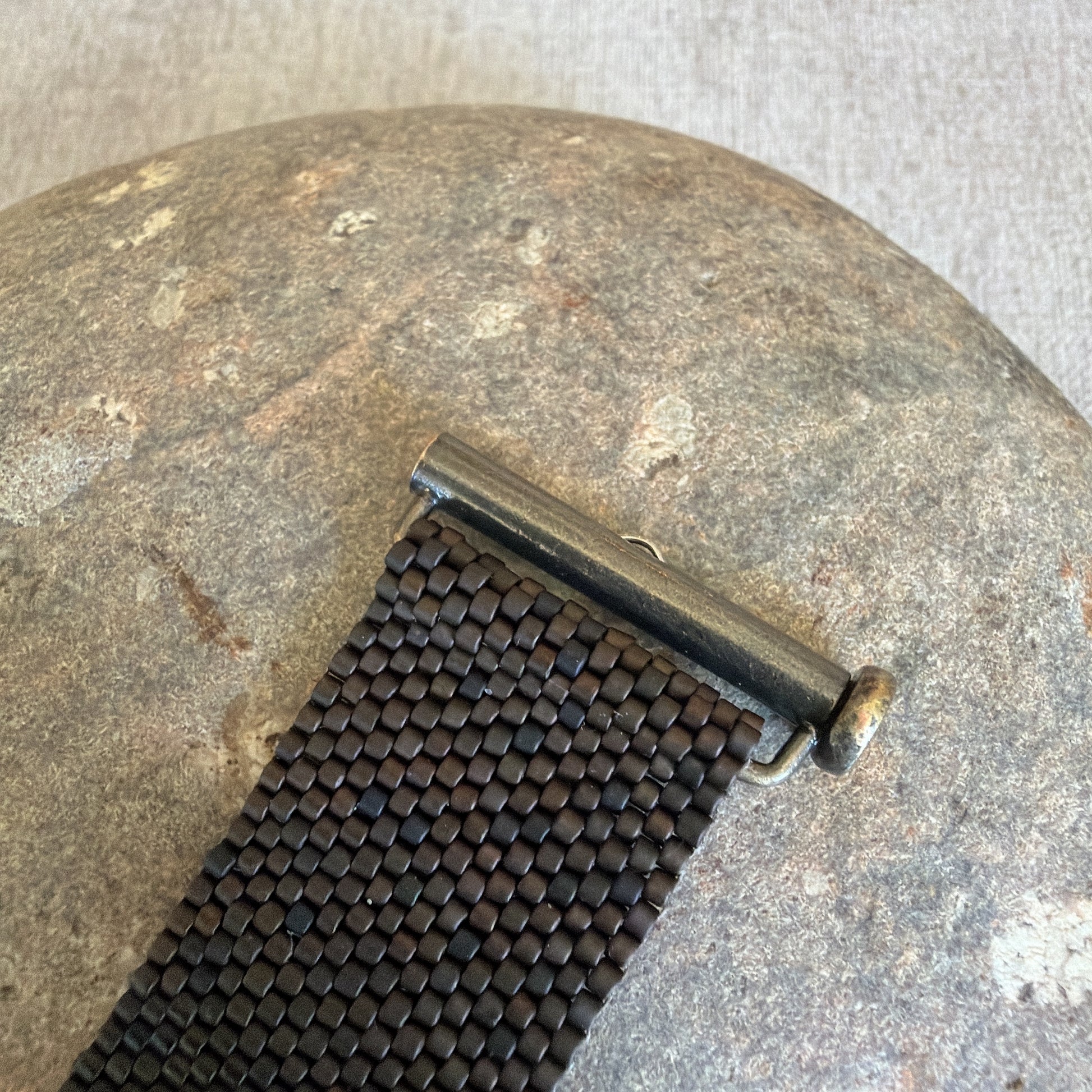 Esta pulsera fue tejida para equilibrar fuerza y armonía. Las barras de mostacillas en tonos tierra, turquesa y verde musgo se cruzan como acordes de una melodía antigua, mientras las piedras pulidas—cada una con su mapa interior—parecen marcar los acentos de un ritmo que conecta con lo ancestral. El fondo tierra mate le da soporte y profundidad, como un telón que deja brillar los colores sin imponerse.