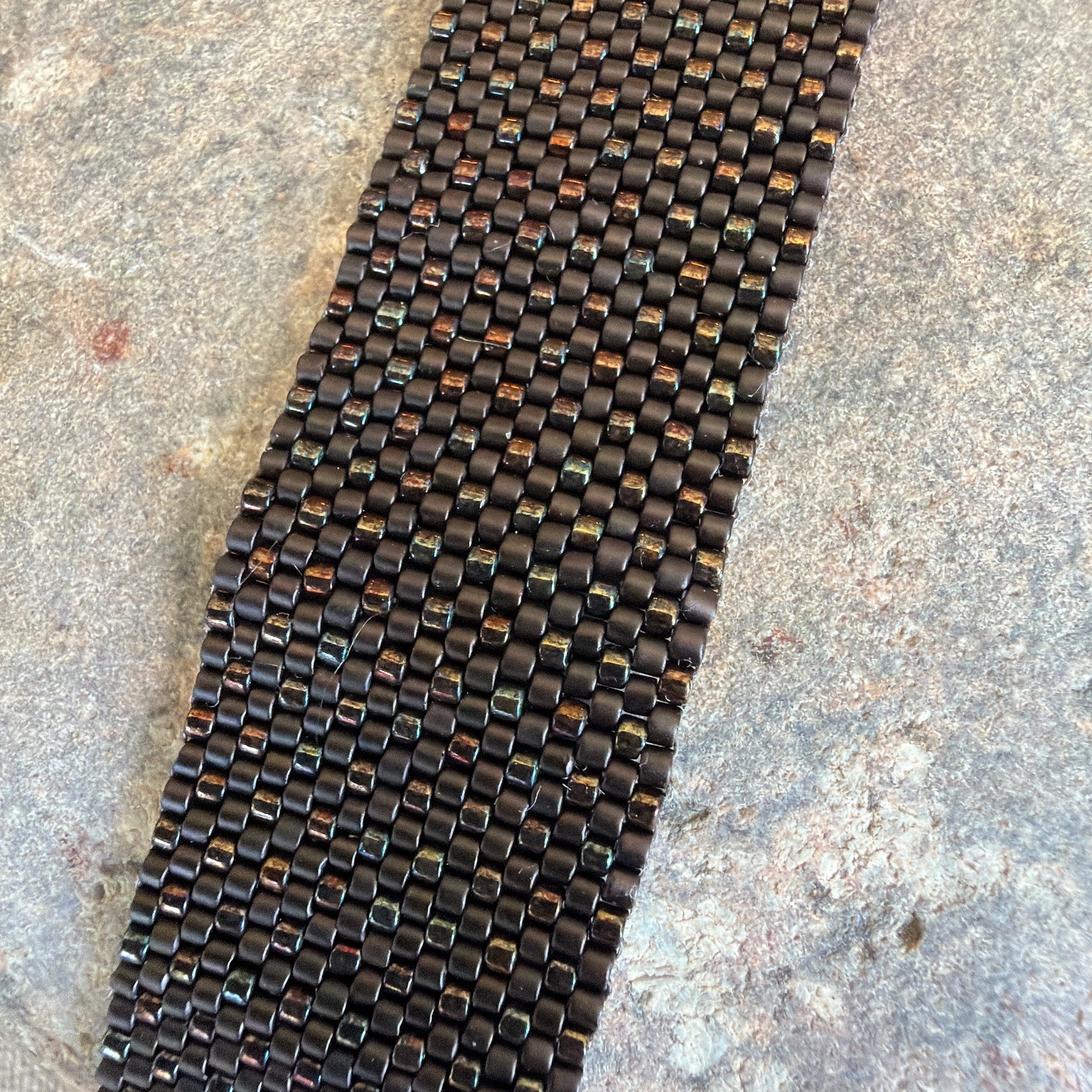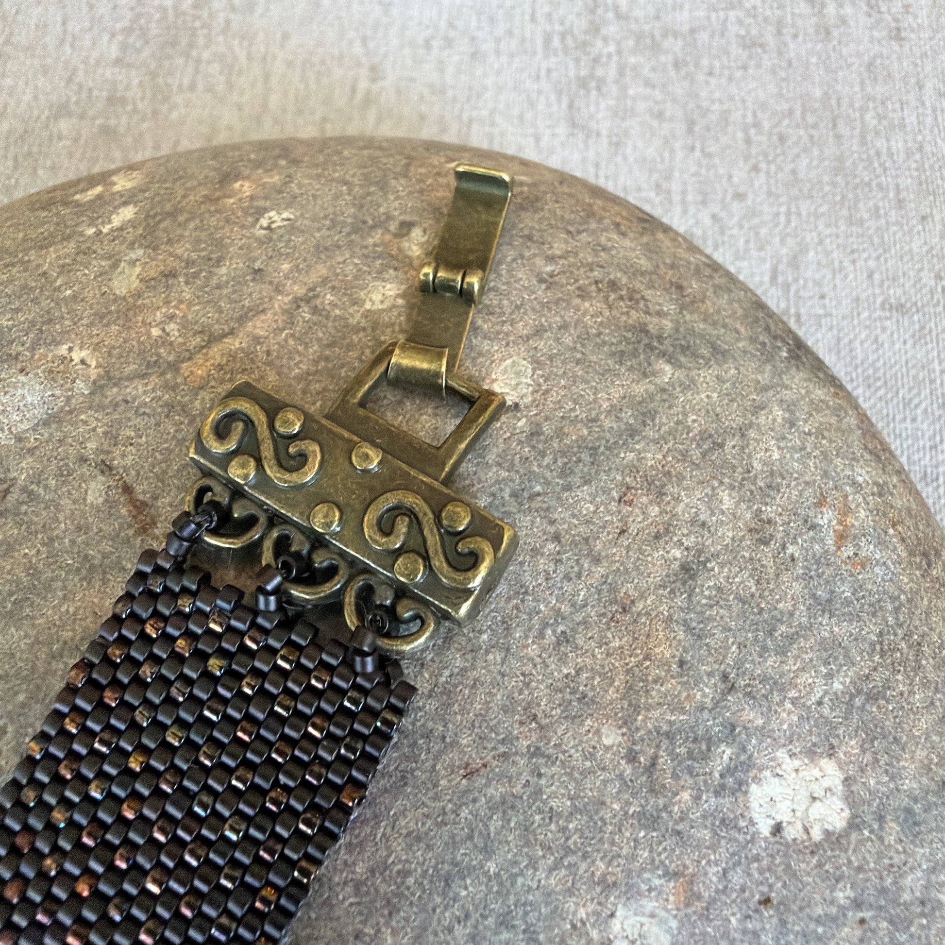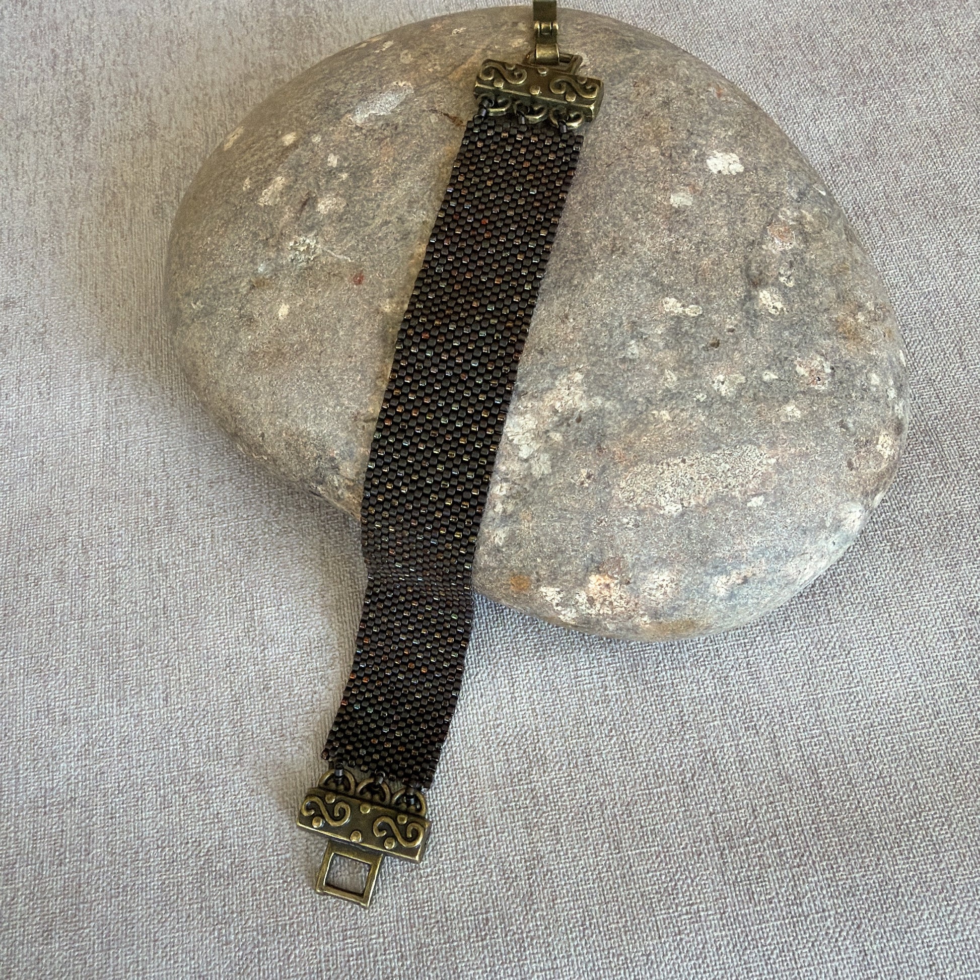 Pulsera tejida con mostacillas de acabado mate y brillos intermitentes que emergen solo al girarla bajo la luz, como si hablara en voz baja. Sus tonos tierra oscuros se funden en un entramado hipnótico que se siente ancestral, mientras el cierre metálico ornamentado evoca reliquias de otros tiempos.