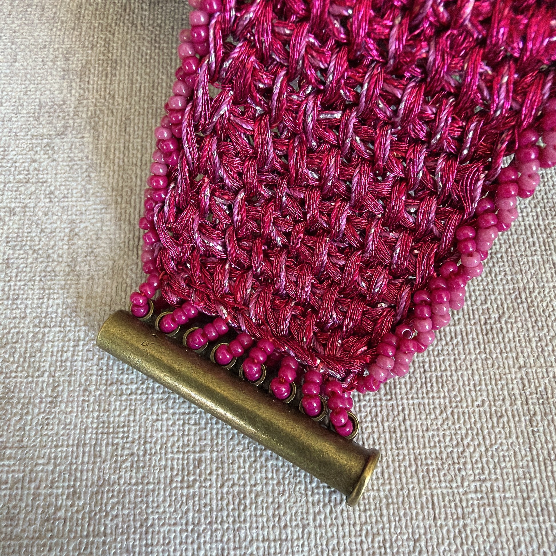 Esta pulsera celebra la textura y la intensidad. Tejida con hilos brillantes en un tono carmesí profundo, juega con la luz y el movimiento gracias a su entramado ancho y su borde de mostacillas que realza cada gesto. El cierre metálico envejecido le da un contraste elegante y sobrio.