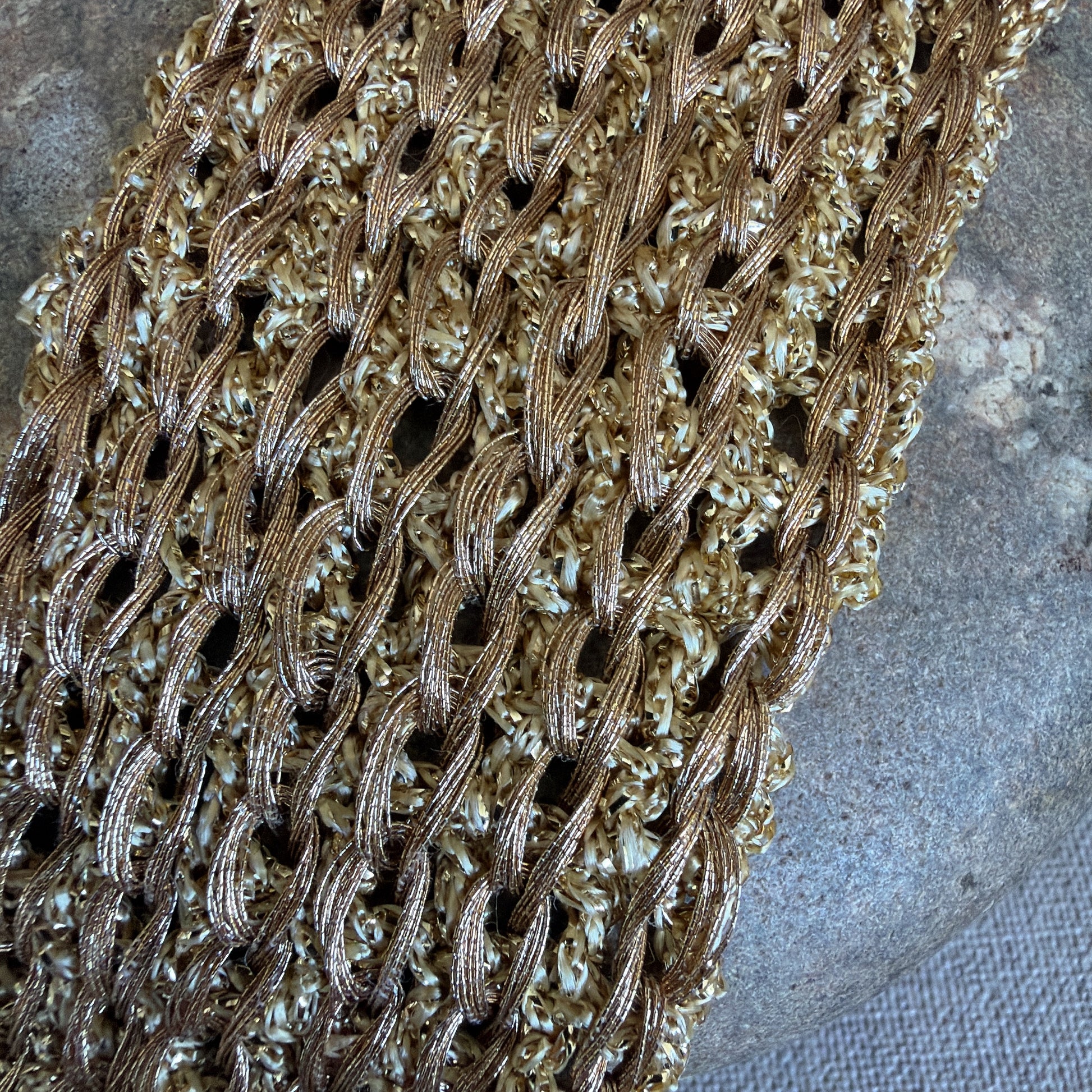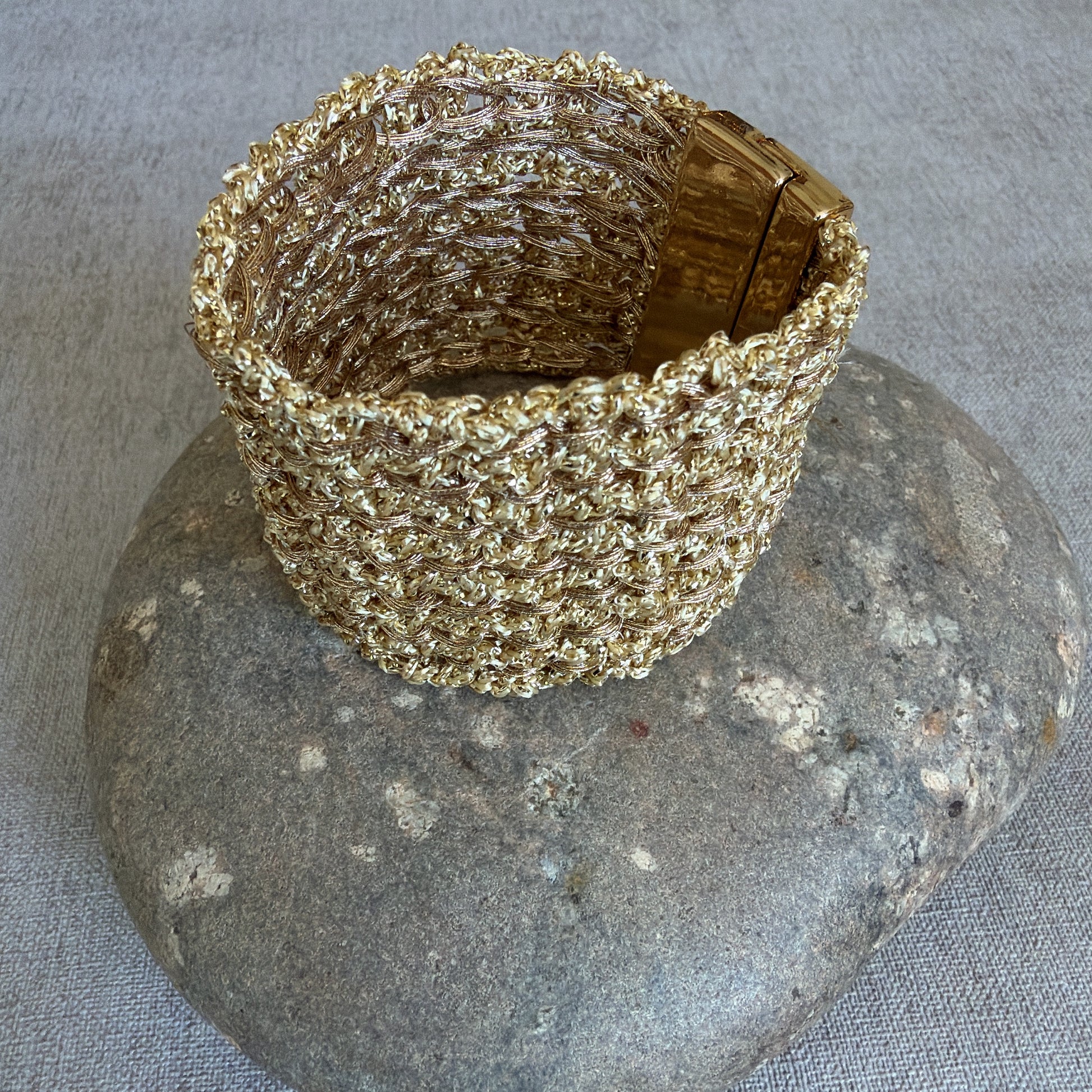 Pulsera tejida a mano con hilos metálicos dorados de textura rica y flexible. Su diseño ancho combina brillo y suavidad en un entramado que se adapta con elegancia a tu muñeca. Cierre magnético en tono oro para un acabado pulido y seguro.