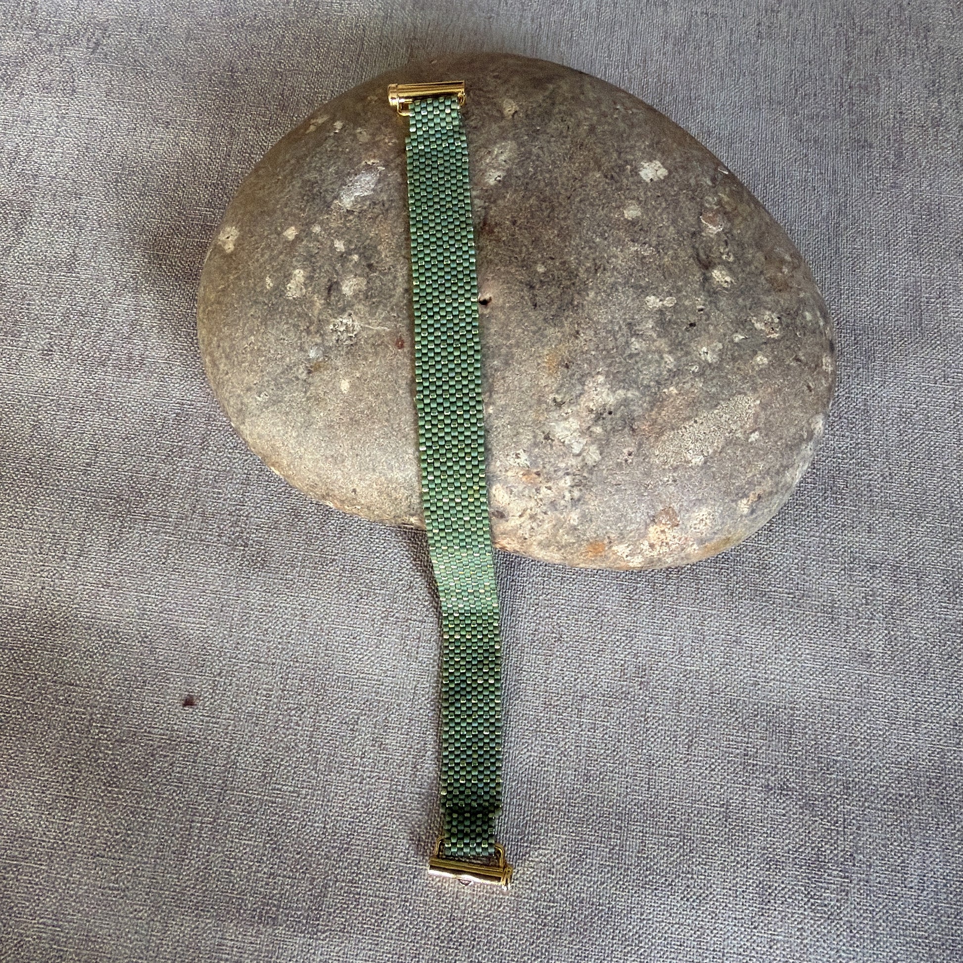 Esta pulsera parece sencilla… hasta que la miras de cerca. Cada mostacilla verde refleja la luz como el follaje húmedo después de la lluvia. Está tejida con precisión en técnica peyote, logrando una textura tan uniforme que casi parece un tejido de tela metálica suave. El broche dorado agrega un toque inesperado, como un rayo de sol que atraviesa el bosque.