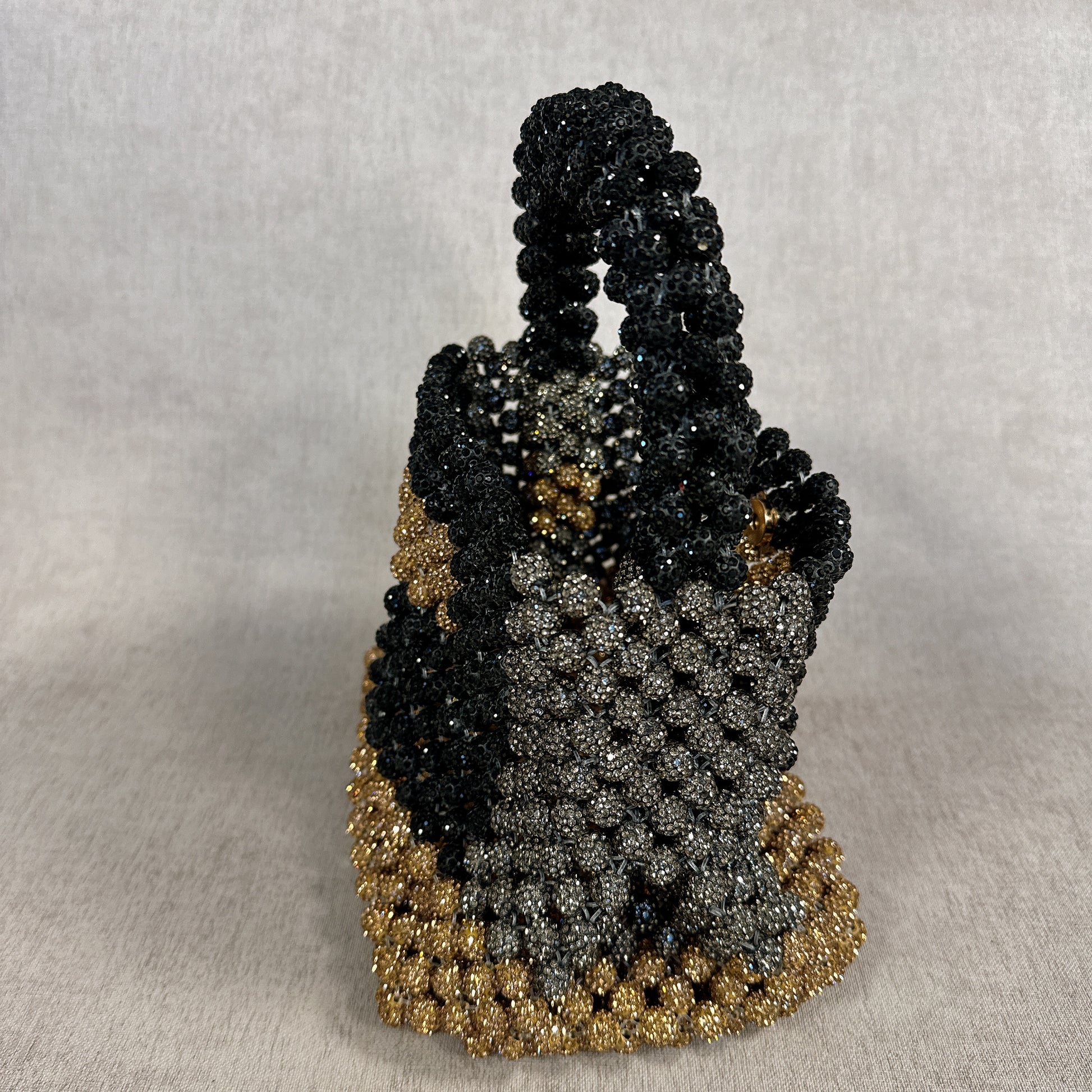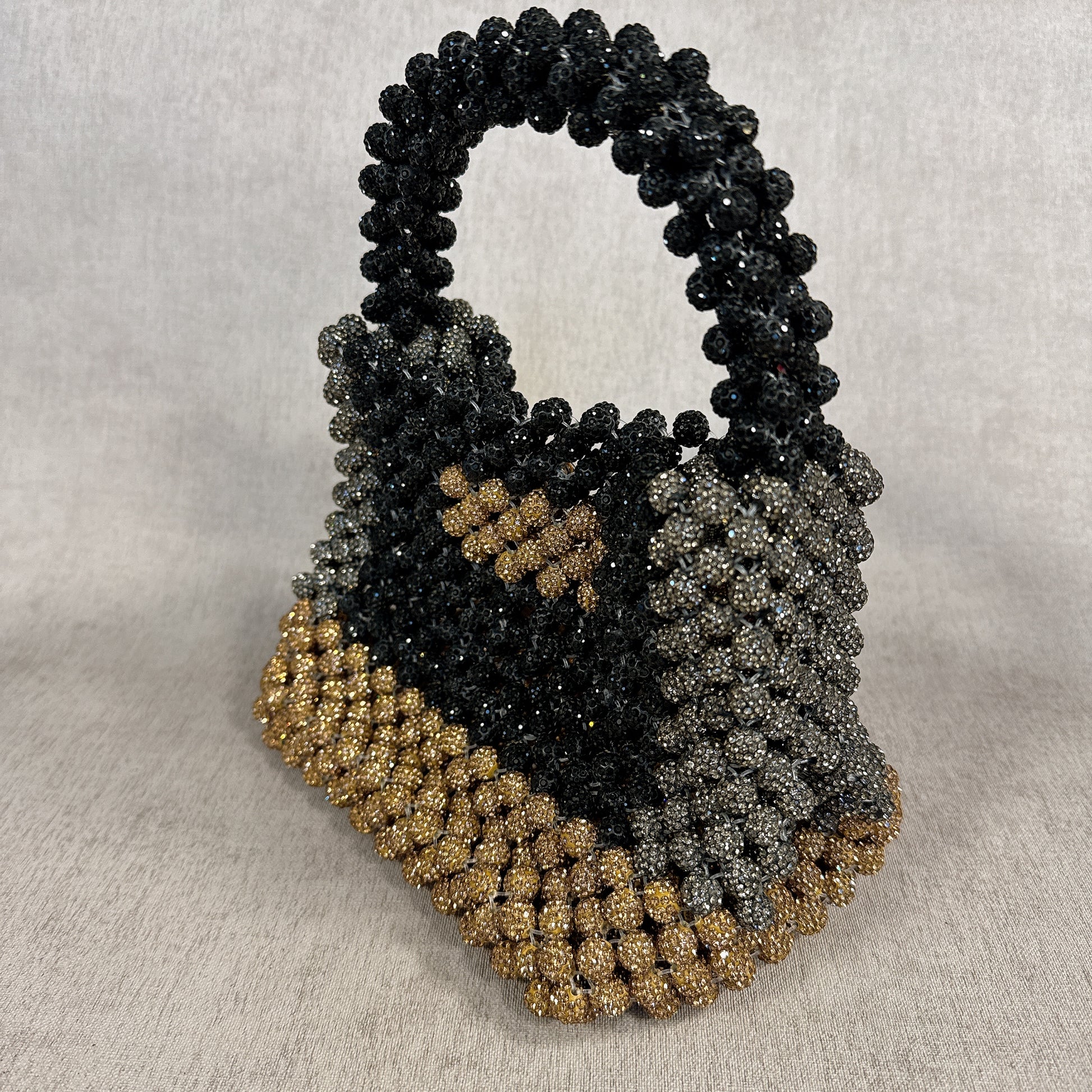 Cartera tejida a mano con mostacillas en tonos negro, plateado y dorado que se entrelazan como un juego de luces en la noche. Su brillo la convierte en una pieza sofisticada y llamativa, capaz de transformar un atuendo sencillo en un look elegante y lleno de carácter. Compacta y firme, es un accesorio pensado para quienes disfrutan destacar con un toque único de artesanía y glamour.